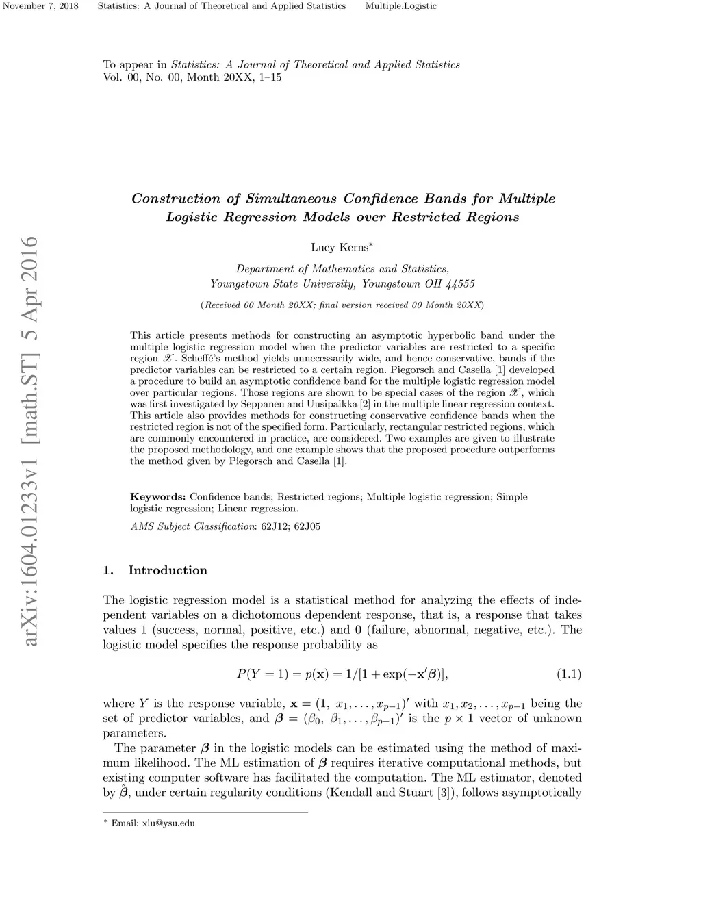 This article presents methods for constructing an asymptotic hyperbolic band under the multiple logistic regression model when the predictor variables are restricted to a specific region . Scheff\'{e}'s method yields unnecessarily wide, and hence conservative, bands if the predictor variables can be restricted to a certain region. Piegorsch and Casella (1988) developed a procedure to build an asymptotic confidence band for the multiple logistic regression model over particular regions. Those regions are shown to be special cases of the region , which was first investigated by Seppanen and Uusipaikka (1992) in the multiple linear regression context. This article also provides methods for constructing conservative confidence bands when the restricted region is not of the specified form. Particularly, rectangular restricted regions, which are commonly encountered in practice, are considered. Two examples are given to illustrate the proposed methodology, and one example shows that the proposed procedure outperforms the method given by Piegorsch and Casella (1988).