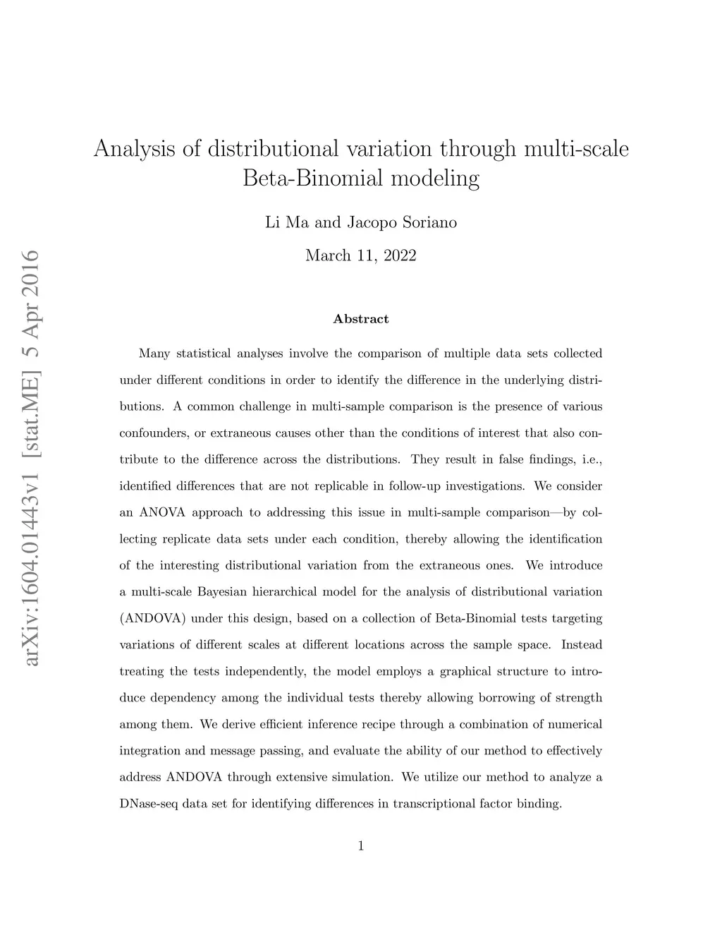 Many statistical analyses involve the comparison of multiple data sets collected under different conditions in order to identify the difference in the underlying distributions. A common challenge in multi-sample comparison is the presence of various confounders, or extraneous causes other than the conditions of interest that also contribute to the difference across the distributions. They result in false findings, i.e., identified differences that are not replicable in follow-up investigations. We consider an ANOVA approach to addressing this issue in multi-sample comparison---by collecting replicate data sets under each condition, thereby allowing the identification of the interesting distributional variation from the extraneous ones. We introduce a multi-scale Bayesian hierarchical model for the analysis of distributional variation (ANDOVA) under this design, based on a collection of Beta-Binomial tests targeting variations of different scales at different locations across the sample space. Instead treating the tests independently, the model employs a graphical structure to introduce dependency among the individual tests thereby allowing borrowing of strength among them. We derive efficient inference recipe through a combination of numerical integration and message passing, and evaluate the ability of our method to effectively address ANDOVA through extensive simulation. We utilize our method to analyze a DNase-seq data set for identifying differences in transcriptional factor binding.