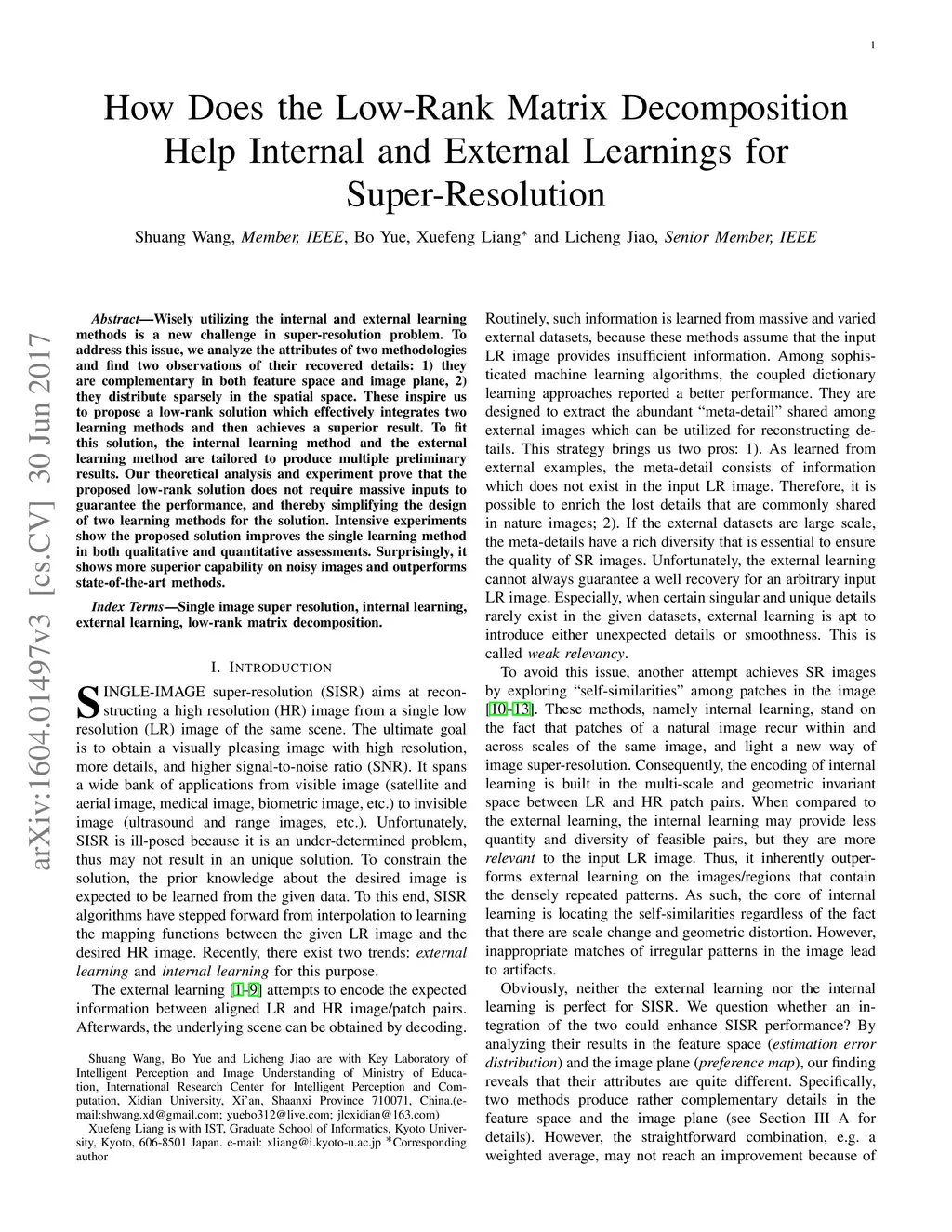 Wisely utilizing the internal and external learning methods is a new challenge in super-resolution problem. To address this issue, we analyze the attributes of two methodologies and find two observations of their recovered details: 1) they are complementary in both feature space and image plane, 2) they distribute sparsely in the spatial space. These inspire us to propose a low-rank solution which effectively integrates two learning methods and then achieves a superior result. To fit this solution, the internal learning method and the external learning method are tailored to produce multiple preliminary results. Our theoretical analysis and experiment prove that the proposed low-rank solution does not require massive inputs to guarantee the performance, and thereby simplifying the design of two learning methods for the solution. Intensive experiments show the proposed solution improves the single learning method in both qualitative and quantitative assessments. Surprisingly, it shows more superior capability on noisy images and outperforms state-of-the-art methods.