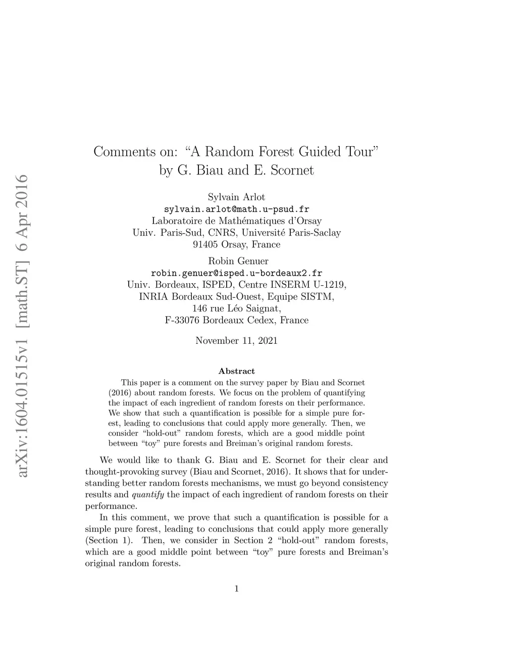 This paper is a comment on the survey paper by Biau and Scornet (2016) about random forests. We focus on the problem of quantifying the impact of each ingredient of random forests on their performance. We show that such a quantification is possible for a simple pure forest , leading to conclusions that could apply more generally. Then, we consider "hold-out" random forests, which are a good middle point between "toy" pure forests and Breiman's original random forests.