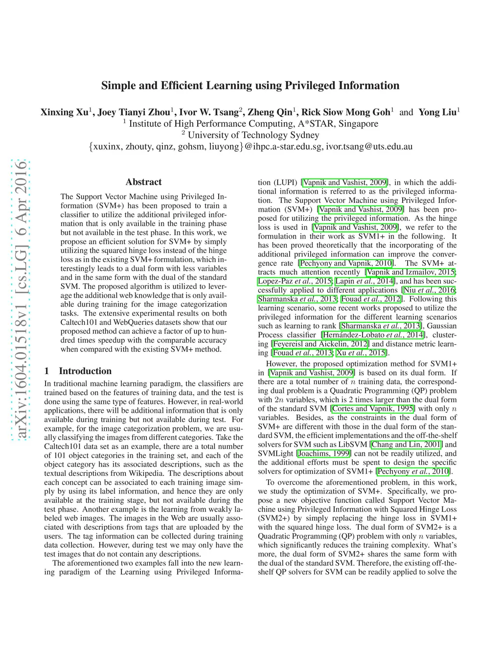 The Support Vector Machine using Privileged Information (SVM+) has been proposed to train a classifier to utilize the additional privileged information that is only available in the training phase but not available in the test phase. In this work, we propose an efficient solution for SVM+ by simply utilizing the squared hinge loss instead of the hinge loss as in the existing SVM+ formulation, which interestingly leads to a dual form with less variables and in the same form with the dual of the standard SVM. The proposed algorithm is utilized to leverage the additional web knowledge that is only available during training for the image categorization tasks. The extensive experimental results on both Caltech101 andWebQueries datasets show that our proposed method can achieve a factor of up to hundred times speedup with the comparable accuracy when compared with the existing SVM+ method.