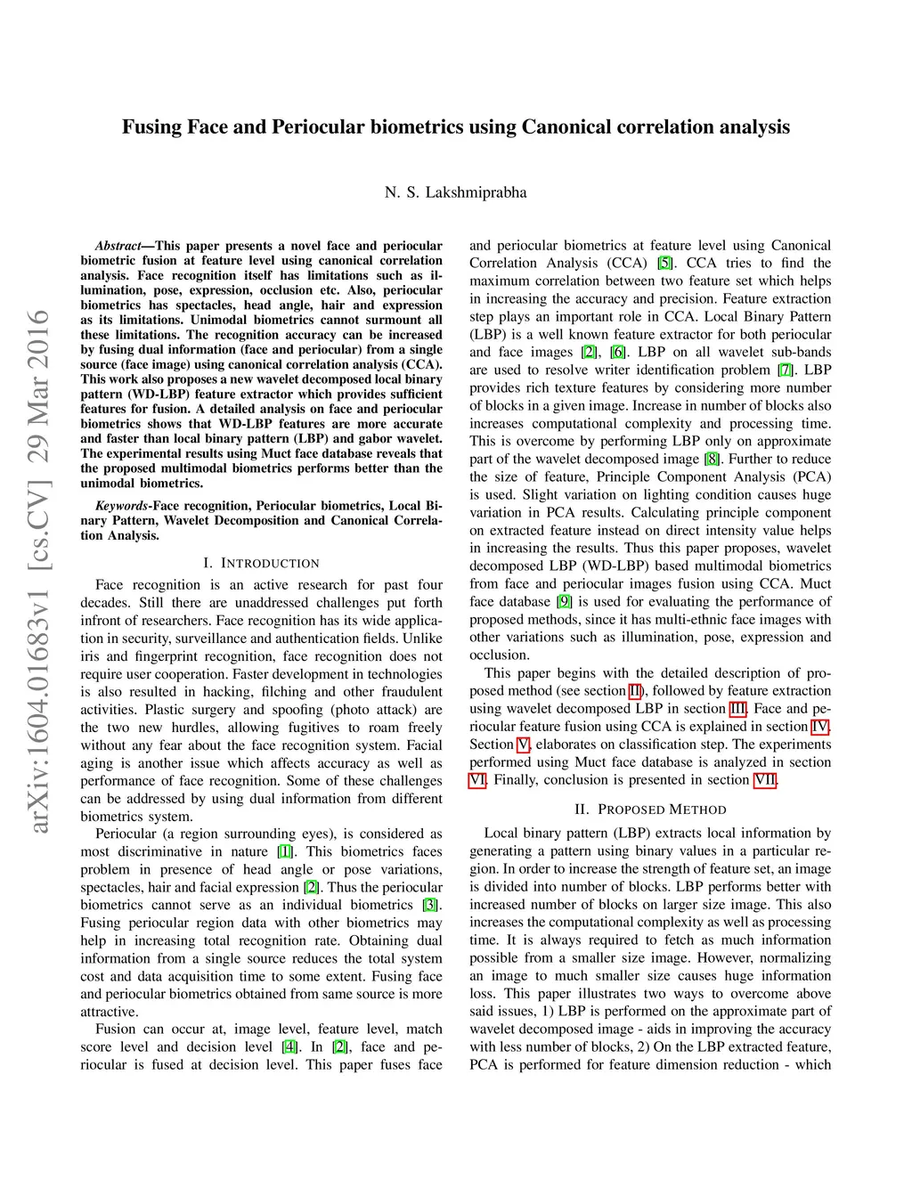 This paper presents a novel face and periocular biometric fusion at feature level using canonical correlation analysis. Face recognition itself has limitations such as illumination, pose, expression, occlusion etc. Also, periocular biometrics has spectacles, head angle, hair and expression as its limitations. Unimodal biometrics cannot surmount all these limitations. The recognition accuracy can be increased by fusing dual information (face and periocular) from a single source (face image) using canonical correlation analysis (CCA). This work also proposes a new wavelet decomposed local binary pattern (WD-LBP) feature extractor which provides sufficient features for fusion. A detailed analysis on face and periocular biometrics shows that WD-LBP features are more accurate and faster than local binary pattern (LBP) and gabor wavelet. The experimental results using Muct face database reveals that the proposed multimodal biometrics performs better than the unimodal biometrics.