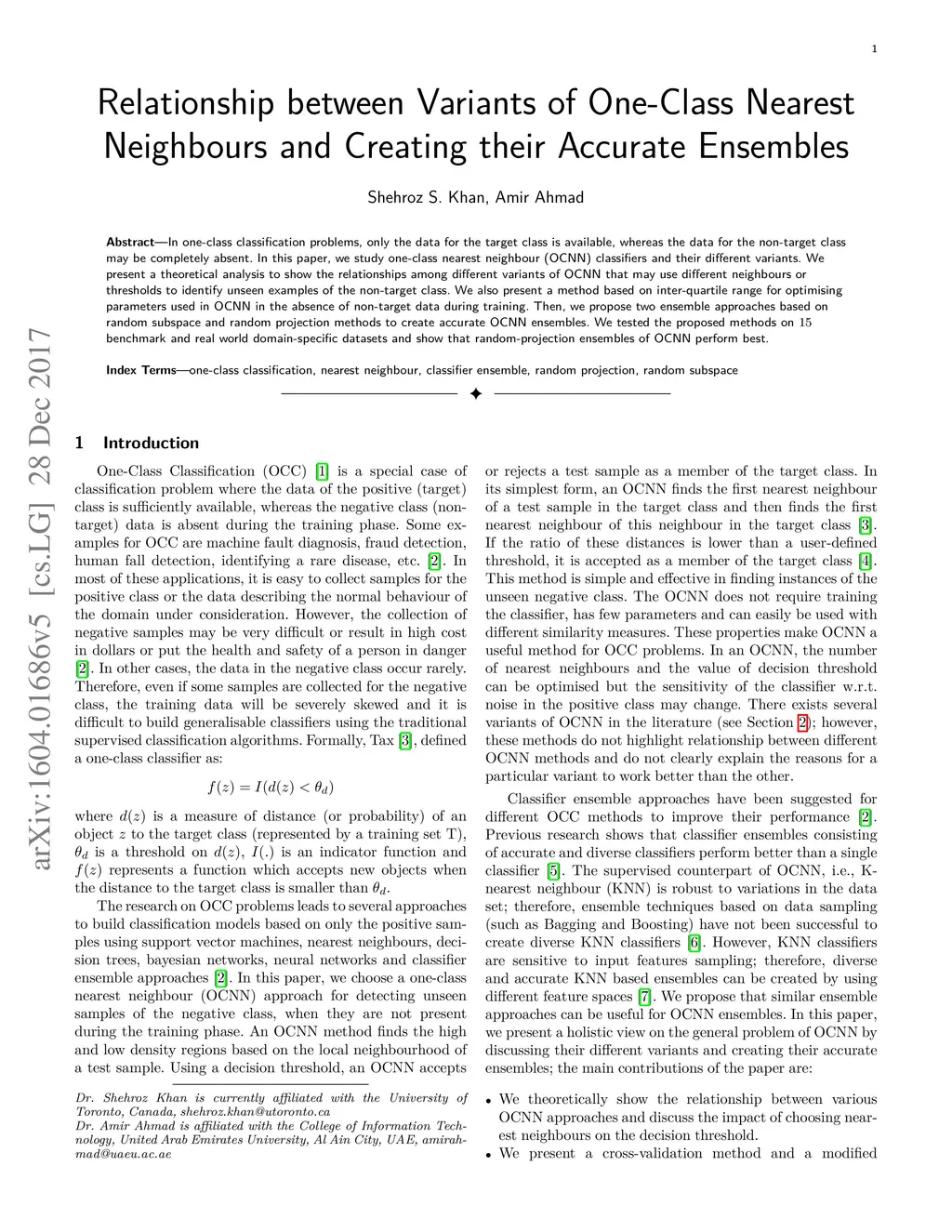In one-class classification problems, only the data for the target class is available, whereas the data for the non-target class may be completely absent. In this paper, we study one-class nearest neighbour (OCNN) classifiers and their different variants. We present a theoretical analysis to show the relationships among different variants of OCNN that may use different neighbours or thresholds to identify unseen examples of the non-target class. We also present a method based on inter-quartile range for optimising parameters used in OCNN in the absence of non-target data during training. Then, we propose two ensemble approaches based on random subspace and random projection methods to create accurate OCNN ensembles. We tested the proposed methods on 15 benchmark and real world domain-specific datasets and show that random-projection ensembles of OCNN perform best.