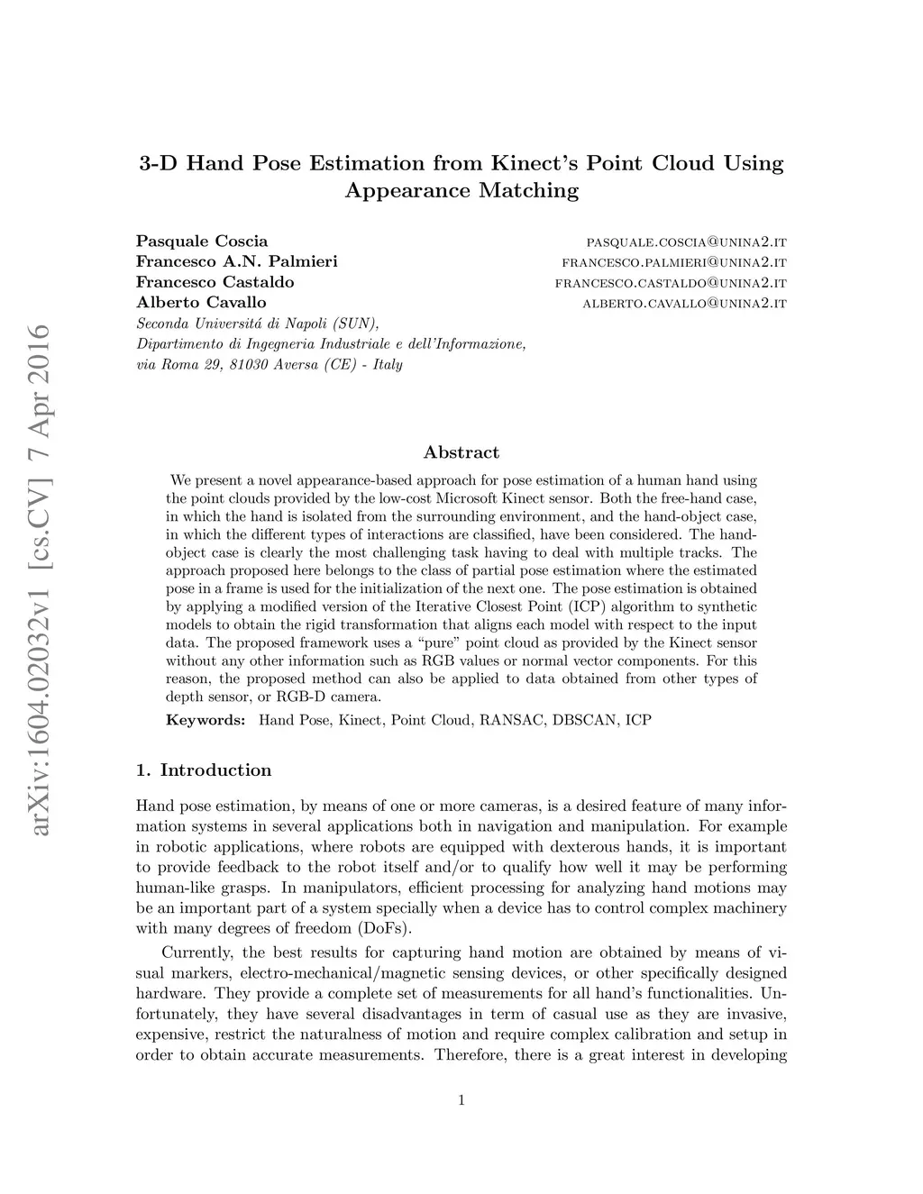 3-D Hand Pose Estimation from Kinect's Point Cloud Using Appearance