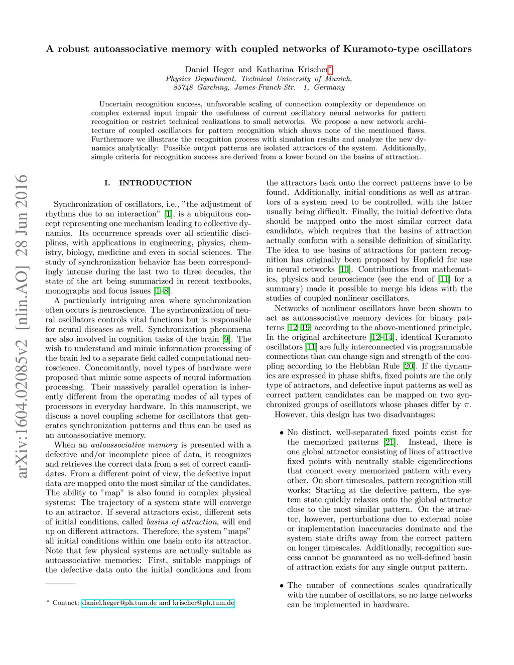 Uncertain recognition success, unfavorable scaling of connection complexity or dependence on complex external input impair the usefulness of current oscillatory neural networks for pattern recognition or restrict technical realizations to small networks. We propose a new network architecture of coupled oscillators for pattern recognition which shows none of the mentioned aws. Furthermore we illustrate the recognition process with simulation results and analyze the new dynamics analytically: Possible output patterns are isolated attractors of the system. Additionally, simple criteria for recognition success are derived from a lower bound on the basins of attraction.