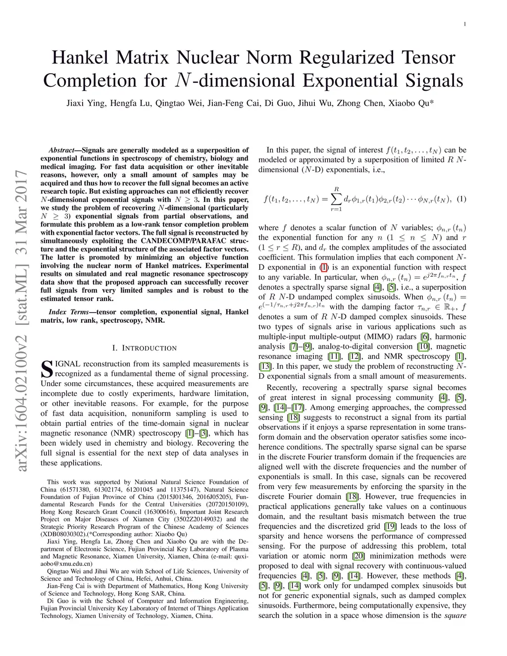 Signals are generally modeled as a superposition of exponential functions in spectroscopy of chemistry, biology and medical imaging. For fast data acquisition or other inevitable reasons, however, only a small amount of samples may be acquired and thus how to recover the full signal becomes an active research topic. But existing approaches can not efficiently recover -dimensional exponential signals with . In this paper, we study the problem of recovering N-dimensional (particularly ) exponential signals from partial observations, and formulate this problem as a low-rank tensor completion problem with exponential factor vectors. The full signal is reconstructed by simultaneously exploiting the CANDECOMP/PARAFAC structure and the exponential structure of the associated factor vectors. The latter is promoted by minimizing an objective function involving the nuclear norm of Hankel matrices. Experimental results on simulated and real magnetic resonance spectroscopy data show that the proposed approach can successfully recover full signals from very limited samples and is robust to the estimated tensor rank.
