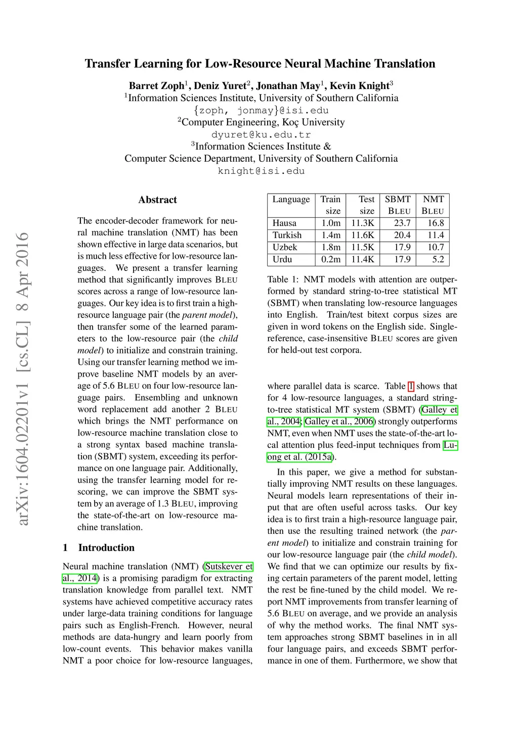 The encoder-decoder framework for neural machine translation (NMT) has been shown effective in large data scenarios, but is much less effective for low-resource languages. We present a transfer learning method that significantly improves Bleu scores across a range of low-resource languages. Our key idea is to first train a high-resource language pair (the parent model), then transfer some of the learned parameters to the low-resource pair (the child model) to initialize and constrain training. Using our transfer learning method we improve baseline NMT models by an average of 5.6 Bleu on four low-resource language pairs. Ensembling and unknown word replacement add another 2 Bleu which brings the NMT performance on low-resource machine translation close to a strong syntax based machine translation (SBMT) system, exceeding its performance on one language pair. Additionally, using the transfer learning model for re-scoring, we can improve the SBMT system by an average of 1.3 Bleu, improving the state-of-the-art on low-resource machine translation.