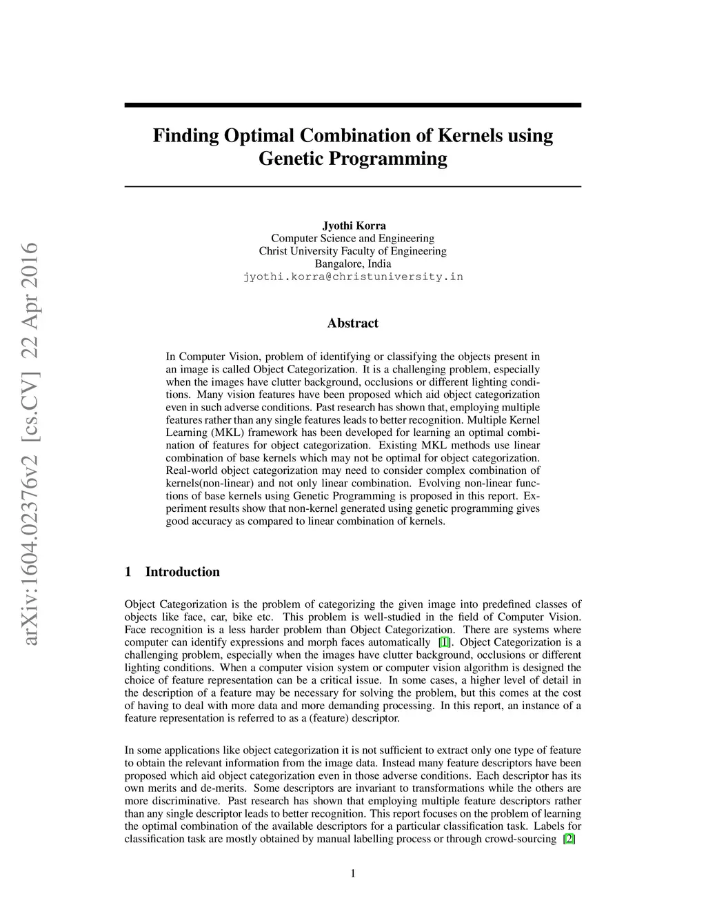 In Computer Vision, problem of identifying or classifying the objects present in an image is called Object Categorization. It is a challenging problem, especially when the images have clutter background, occlusions or different lighting conditions. Many vision features have been proposed which aid object categorization even in such adverse conditions. Past research has shown that, employing multiple features rather than any single features leads to better recognition. Multiple Kernel Learning (MKL) framework has been developed for learning an optimal combination of features for object categorization. Existing MKL methods use linear combination of base kernels which may not be optimal for object categorization. Real-world object categorization may need to consider complex combination of kernels(non-linear) and not only linear combination. Evolving non-linear functions of base kernels using Genetic Programming is proposed in this report. Experiment results show that non-kernel generated using genetic programming gives good accuracy as compared to linear combination of kernels.