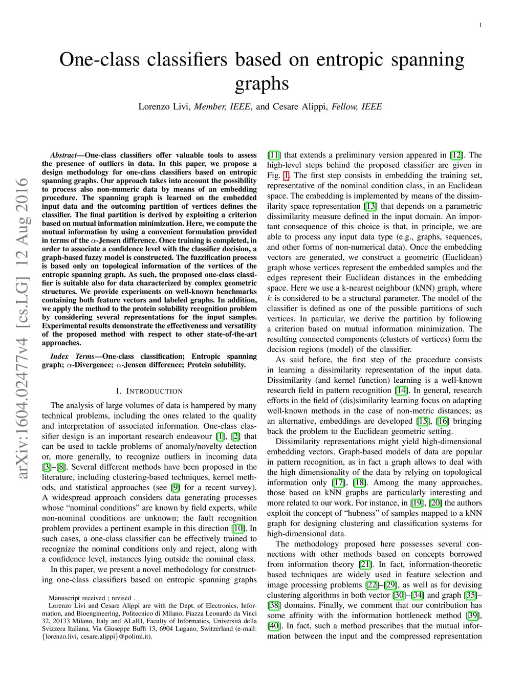 One-class classifiers offer valuable tools to assess the presence of outliers in data. In this paper, we propose a design methodology for one-class classifiers based on entropic spanning graphs. The spanning graph is learned on the embedded input data, with the aim to generate a partition of the vertices. The final partition is derived by exploiting a criterion based on mutual information minimization. Here, we compute the mutual information by using a convenient formulation provided in terms of the -Jensen difference. Once training is completed, in order to associate a confidence level with the classifier decision, a graph-based fuzzy model is constructed. The fuzzification process is based only on topological information of the vertices of the entropic spanning graph. As such, the proposed one-class classifier is suitable also for datasets with complex geometric structures. We provide experiments on well-known benchmarking datasets containing both feature vectors and labeled graphs. In addition, we apply the method on the problem of protein solubility recognition by considering several data representations for the samples. Experimental results demonstrate the effectiveness and versatility of the proposed method with respect to other state-of-the-art approaches.
