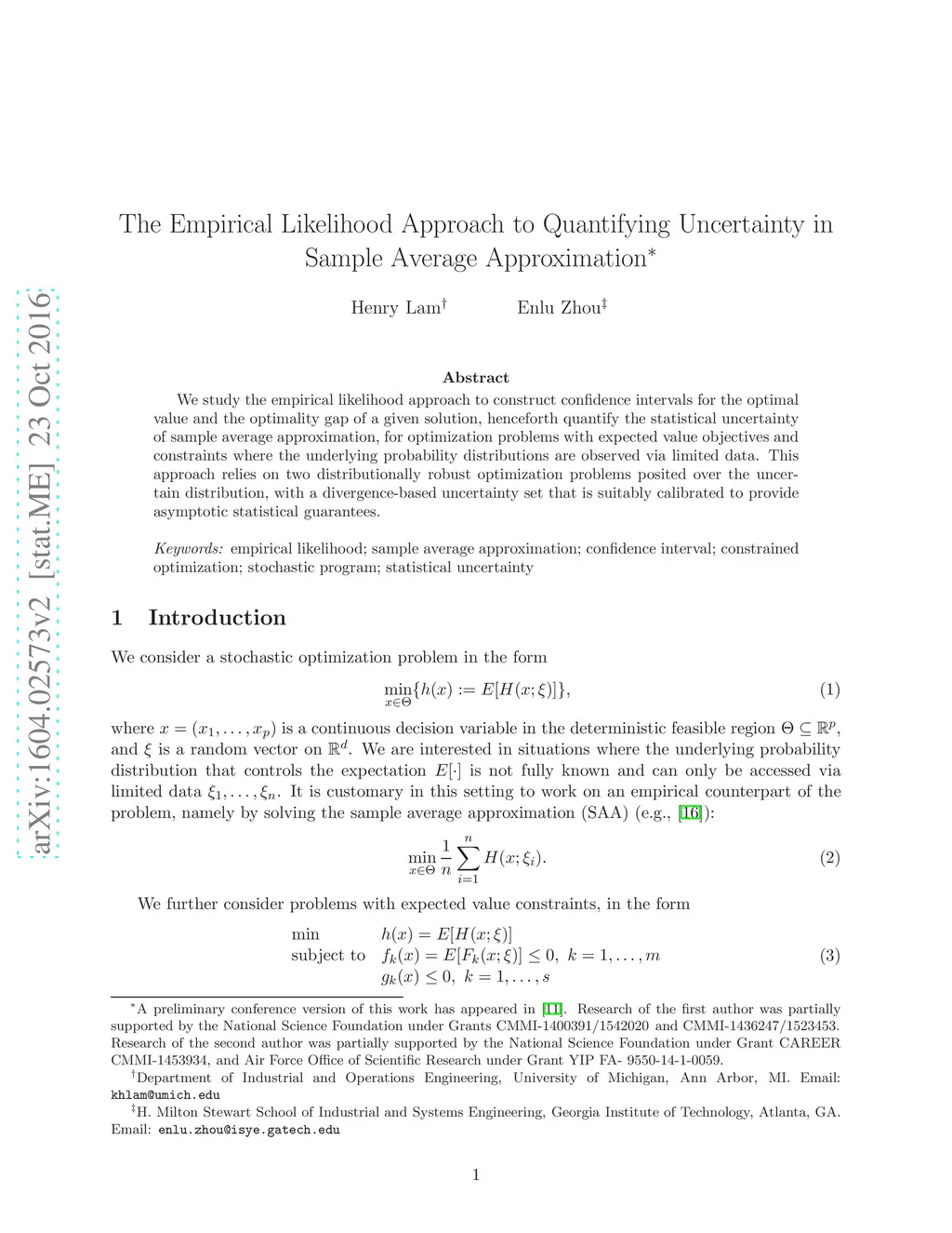 We study the empirical likelihood approach to construct confidence intervals for the optimal value and the optimality gap of a given solution, henceforth quantify the statistical uncertainty of sample average approximation, for optimization problems with expected value objectives and constraints where the underlying probability distributions are observed via limited data. This approach relies on two distributionally robust optimization problems posited over the uncertain distribution, with a divergence-based uncertainty set that is suitably calibrated to provide asymptotic statistical guarantees.