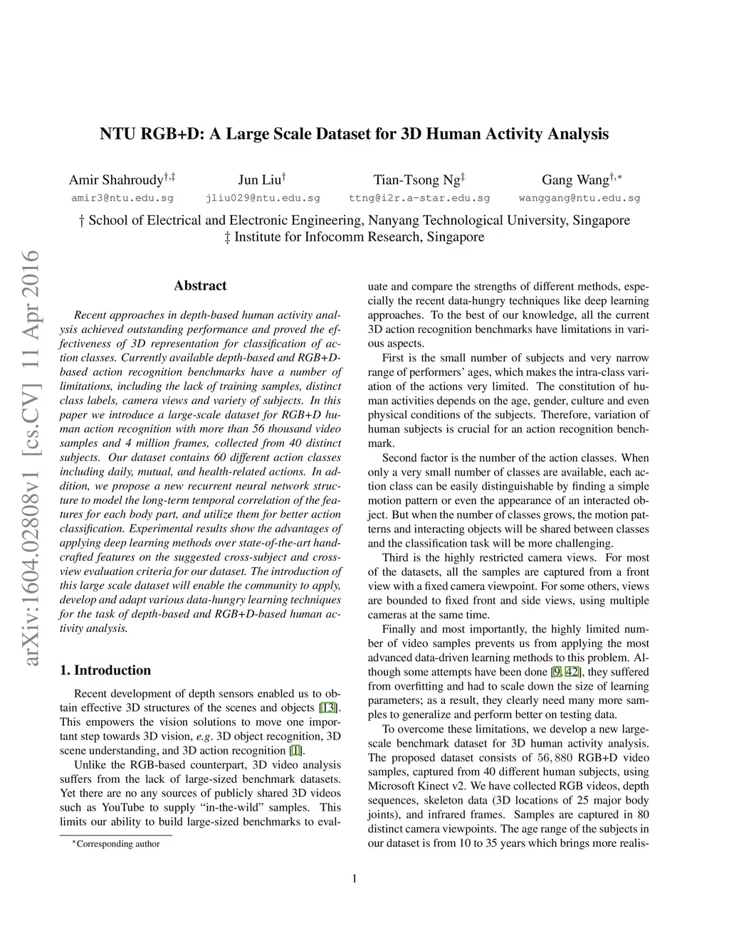 NTU RGB+D: A Large Scale Dataset for 3D Human Activity Analysis