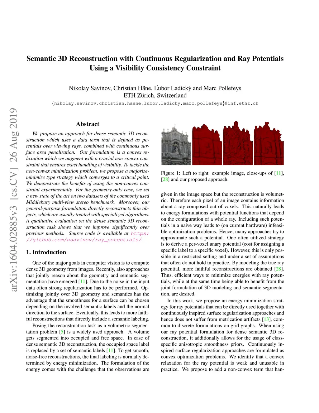 We propose an approach for dense semantic 3D reconstruction which uses a data term that is defined as potentials over viewing rays, combined with continuous surface area penalization. Our formulation is a convex relaxation which we augment with a crucial non-convex constraint that ensures exact handling of visibility. To tackle the non-convex minimization problem, we propose a majorize-minimize type strategy which converges to a critical point. We demonstrate the benefits of using the non-convex constraint experimentally. For the geometry-only case, we set a new state of the art on two datasets of the commonly used Middlebury multi-view stereo benchmark. Moreover, our general-purpose formulation directly reconstructs thin objects, which are usually treated with specialized algorithms. A qualitative evaluation on the dense semantic 3D reconstruction task shows that we improve significantly over previous methods.