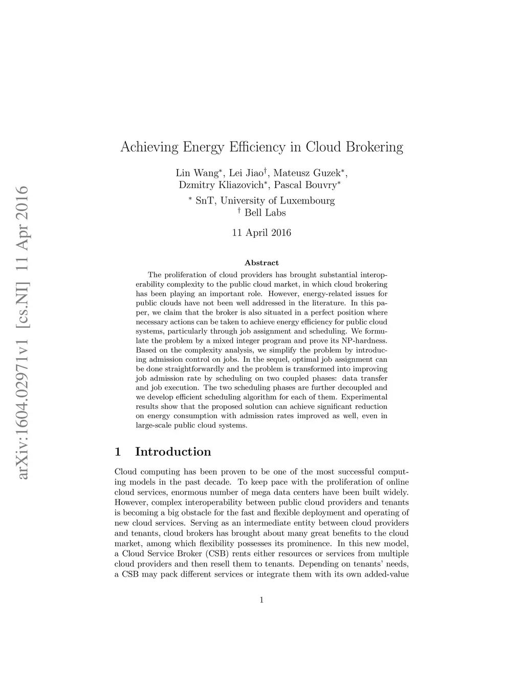 The proliferation of cloud providers has brought substantial interoperability complexity to the public cloud market, in which cloud brokering has been playing an important role. However, energy-related issues for public clouds have not been well addressed in the literature. In this paper, we claim that the broker is also situated in a perfect position where necessary actions can be taken to achieve energy efficiency for public cloud systems, particularly through job assignment and scheduling. We formulate the problem by a mixed integer program and prove its NP-hardness. Based on the complexity analysis, we simplify the problem by introducing admission control on jobs. In the sequel, optimal job assignment can be done straightforwardly and the problem is transformed into improving job admission rate by scheduling on two coupled phases: data transfer and job execution. The two scheduling phases are further decoupled and we develop efficient scheduling algorithm for each of them. Experimental results show that the proposed solution can achieve significant reduction on energy consumption with admission rates improved as well, even in large-scale public cloud systems.