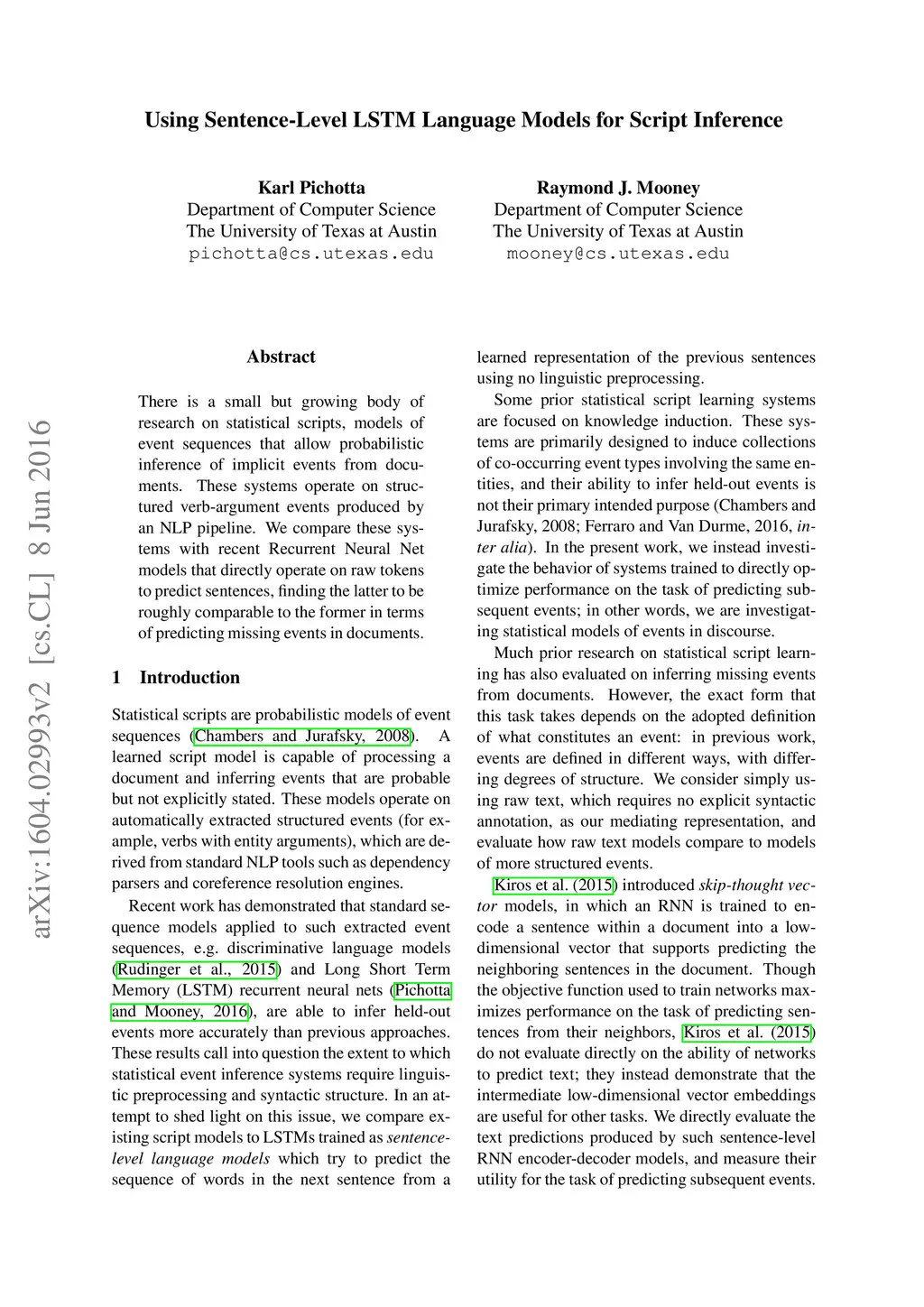 There is a small but growing body of research on statistical scripts, models of event sequences that allow probabilistic inference of implicit events from documents. These systems operate on structured verb-argument events produced by an NLP pipeline. We compare these systems with recent Recurrent Neural Net models that directly operate on raw tokens to predict sentences, finding the latter to be roughly comparable to the former in terms of predicting missing events in documents.