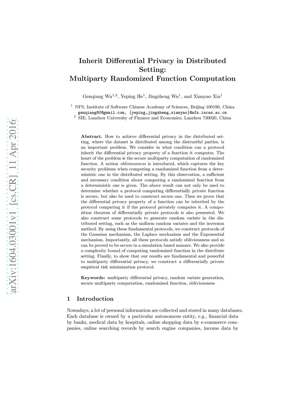 How to achieve differential privacy in the distributed setting, where the dataset is distributed among the distrustful parties, is an important problem. We consider in what condition can a protocol inherit the differential privacy property of a function it computes. The heart of the problem is the secure multiparty computation of randomized function. A notion \emph{obliviousness} is introduced, which captures the key security problems when computing a randomized function from a deterministic one in the distributed setting. By this observation, a sufficient and necessary condition about computing a randomized function from a deterministic one is given. The above result can not only be used to determine whether a protocol computing differentially private function is secure, but also be used to construct secure one. Then we prove that the differential privacy property of a function can be inherited by the protocol computing it if the protocol privately computes it. A composition theorem of differentially private protocols is also presented. We also construct some protocols to generate random variate in the distributed setting, such as the uniform random variates and the inversion method. By using these fundamental protocols, we construct protocols of the Gaussian mechanism, the Laplace mechanism and the Exponential mechanism. Importantly, all these protocols satisfy obliviousness and so can be proved to be secure in a simulation based manner. We also provide a complexity bound of computing randomized function in the distribute setting. Finally, to show that our results are fundamental and powerful to multiparty differential privacy, we construct a differentially private empirical risk minimization protocol.
