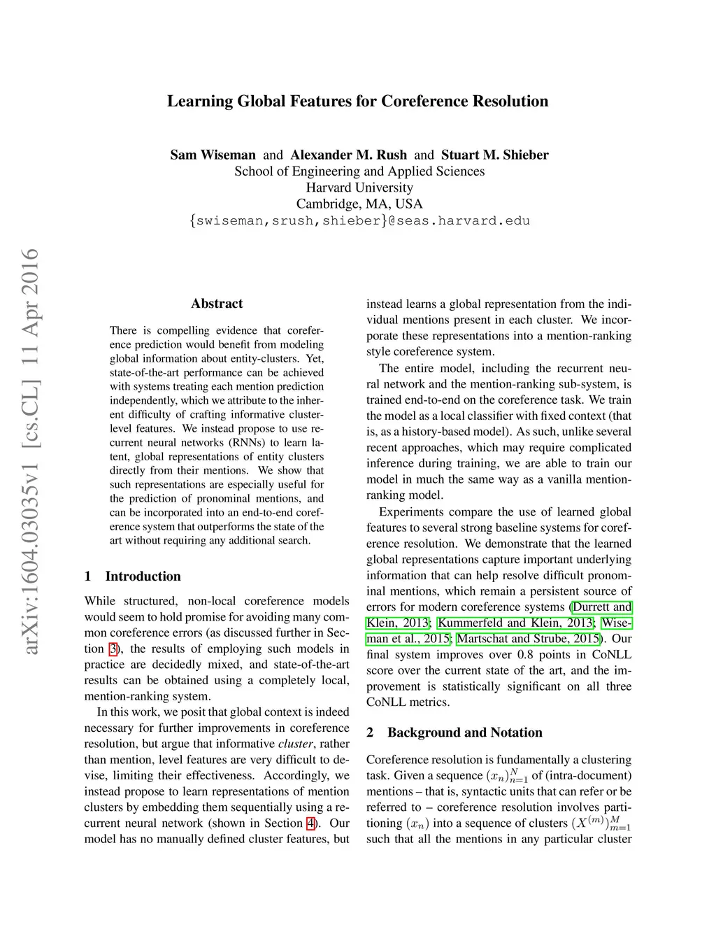 There is compelling evidence that coreference prediction would benefit from modeling global information about entity-clusters. Yet, state-of-the-art performance can be achieved with systems treating each mention prediction independently, which we attribute to the inherent difficulty of crafting informative cluster-level features. We instead propose to use recurrent neural networks (RNNs) to learn latent, global representations of entity clusters directly from their mentions. We show that such representations are especially useful for the prediction of pronominal mentions, and can be incorporated into an end-to-end coreference system that outperforms the state of the art without requiring any additional search.