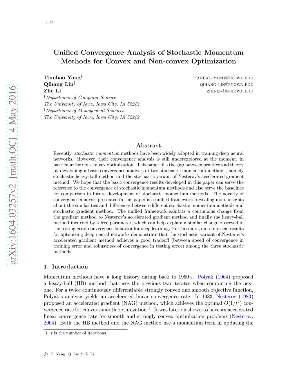 Recently, {\it stochastic momentum} methods have been widely adopted in training deep neural networks. However, their convergence analysis is still underexplored at the moment, in particular for non-convex optimization. This paper fills the gap between practice and theory by developing a basic convergence analysis of two stochastic momentum methods, namely stochastic heavy-ball method and the stochastic variant of Nesterov's accelerated gradient method. We hope that the basic convergence results developed in this paper can serve the reference to the convergence of stochastic momentum methods and also serve the baselines for comparison in future development of stochastic momentum methods. The novelty of convergence analysis presented in this paper is a unified framework, revealing more insights about the similarities and differences between different stochastic momentum methods and stochastic gradient method. The unified framework exhibits a continuous change from the gradient method to Nesterov's accelerated gradient method and finally the heavy-ball method incurred by a free parameter, which can help explain a similar change observed in the testing error convergence behavior for deep learning. Furthermore, our empirical results for optimizing deep neural networks demonstrate that the stochastic variant of Nesterov's accelerated gradient method achieves a good tradeoff (between speed of convergence in training error and robustness of convergence in testing error) among the three stochastic methods.