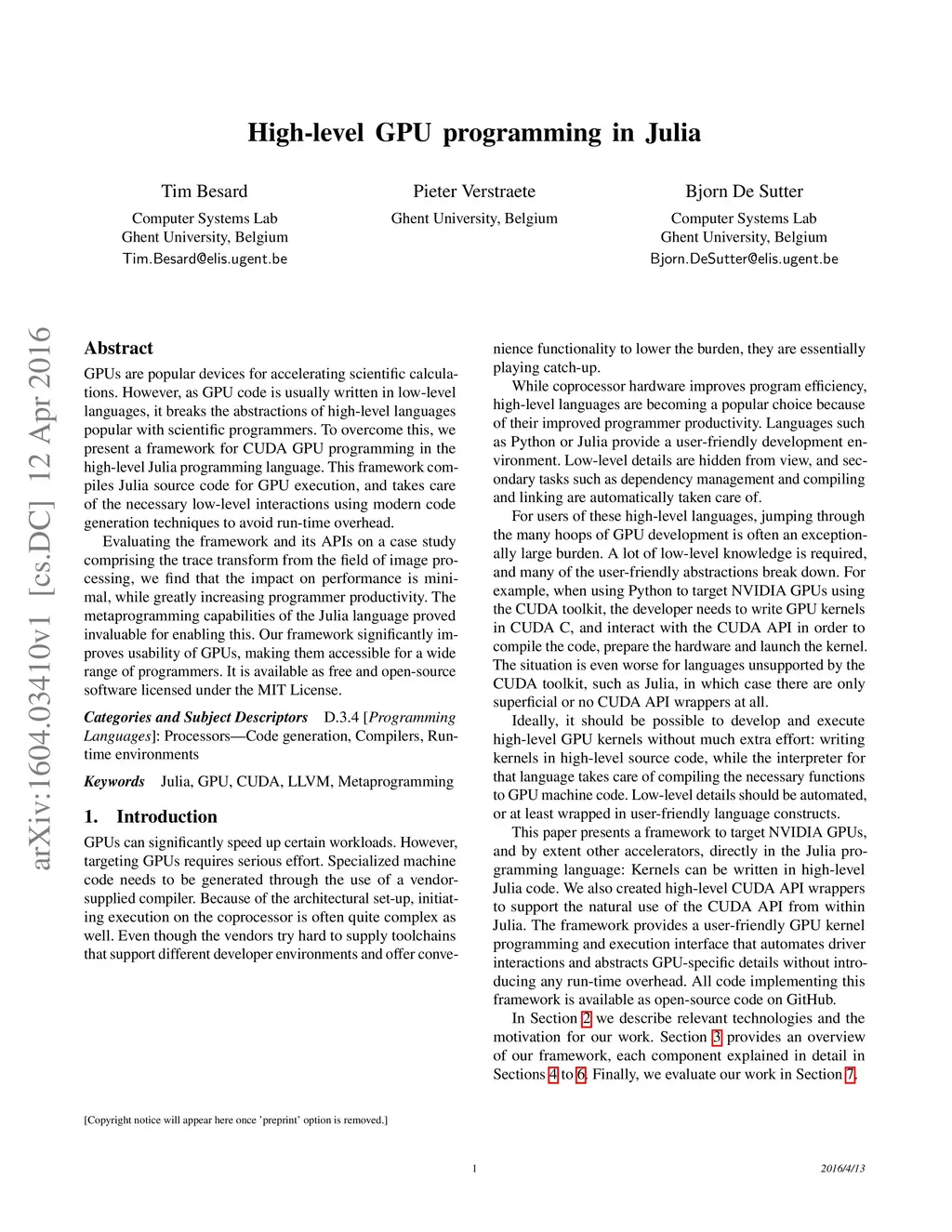 GPUs are popular devices for accelerating scientific calculations. However, as GPU code is usually written in low-level languages, it breaks the abstractions of high-level languages popular with scientific programmers. To overcome this, we present a framework for CUDA GPU programming in the high-level Julia programming language. This framework compiles Julia source code for GPU execution, and takes care of the necessary low-level interactions using modern code generation techniques to avoid run-time overhead. Evaluating the framework and its APIs on a case study comprising the trace transform from the field of image processing, we find that the impact on performance is minimal, while greatly increasing programmer productivity. The metaprogramming capabilities of the Julia language proved invaluable for enabling this. Our framework significantly improves usability of GPUs, making them accessible for a wide range of programmers. It is available as free and open-source software licensed under the MIT License.