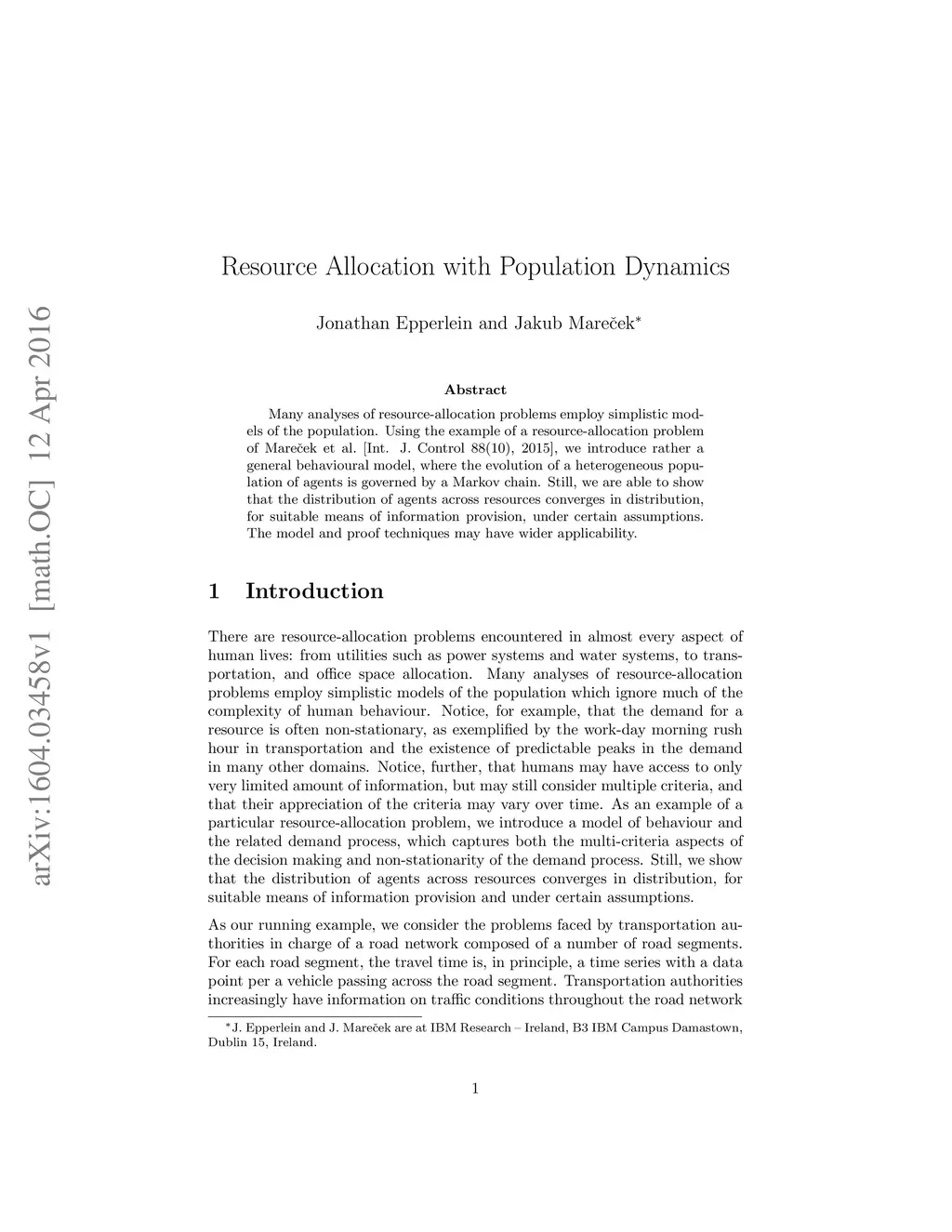 Many analyses of resource-allocation problems employ simplistic models of the population. Using the example of a resource-allocation problem of Marecek et al. [arXiv:1406.7639], we introduce rather a general behavioural model, where the evolution of a heterogeneous population of agents is governed by a Markov chain. Still, we are able to show that the distribution of agents across resources converges in distribution, for suitable means of information provision, under certain assumptions. The model and proof techniques may have wider applicability.