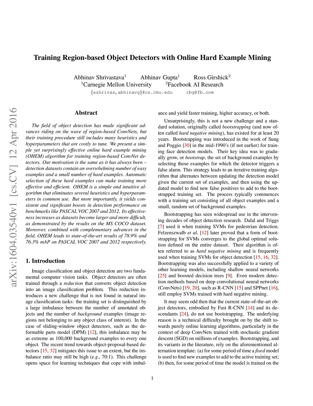 The field of object detection has made significant advances riding on the wave of region-based ConvNets, but their training procedure still includes many heuristics and hyperparameters that are costly to tune. We present a simple yet surprisingly effective online hard example mining (OHEM) algorithm for training region-based ConvNet detectors. Our motivation is the same as it has always been -- detection datasets contain an overwhelming number of easy examples and a small number of hard examples. Automatic selection of these hard examples can make training more effective and efficient. OHEM is a simple and intuitive algorithm that eliminates several heuristics and hyperparameters in common use. But more importantly, it yields consistent and significant boosts in detection performance on benchmarks like PASCAL VOC 2007 and 2012. Its effectiveness increases as datasets become larger and more difficult, as demonstrated by the results on the MS COCO dataset. Moreover, combined with complementary advances in the field, OHEM leads to state-of-the-art results of 78.9% and 76.3% mAP on PASCAL VOC 2007 and 2012 respectively.
