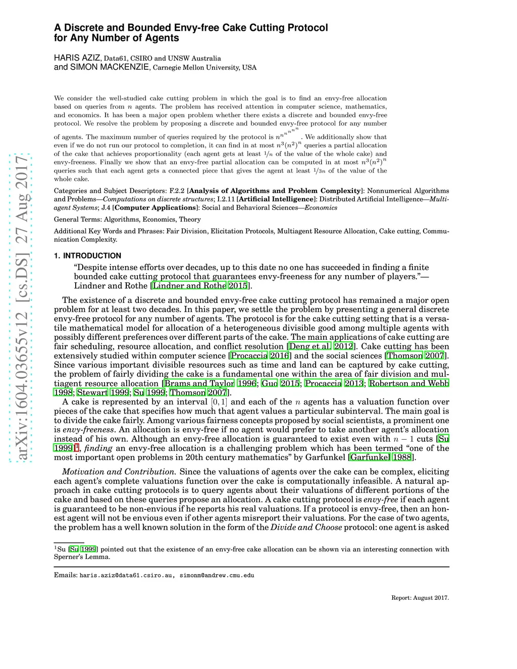 We consider the well-studied cake cutting problem in which the goal is to find an envy-free allocation based on queries from agents. The problem has received attention in computer science, mathematics, and economics. It has been a major open problem whether there exists a discrete and bounded envy-free protocol. We resolve the problem by proposing a discrete and bounded envy-free protocol for any number of agents. The maximum number of queries required by the protocol is . We additionally show that even if we do not run our protocol to completion, it can find in at most queries a partial allocation of the cake that achieves proportionality (each agent gets at least of the value of the whole cake) and envy-freeness. Finally we show that an envy-free partial allocation can be computed in at most queries such that each agent gets a connected piece that gives the agent at least of the value of the whole cake.