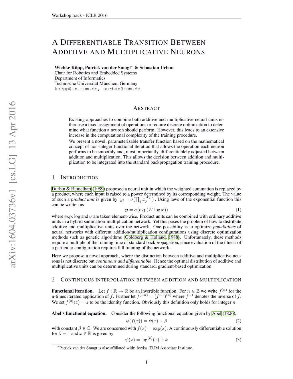 Existing approaches to combine both additive and multiplicative neural units either use a fixed assignment of operations or require discrete optimization to determine what function a neuron should perform. However, this leads to an extensive increase in the computational complexity of the training procedure. We present a novel, parameterizable transfer function based on the mathematical concept of non-integer functional iteration that allows the operation each neuron performs to be smoothly and, most importantly, differentiablely adjusted between addition and multiplication. This allows the decision between addition and multiplication to be integrated into the standard backpropagation training procedure.