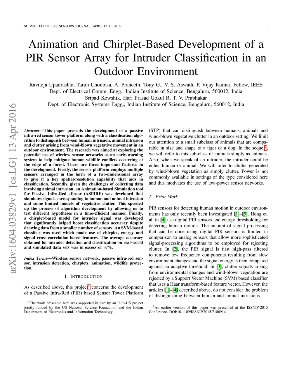 This paper presents the development of a passive infra-red sensor tower platform along with a classification algorithm to distinguish between human intrusion, animal intrusion and clutter arising from wind-blown vegetative movement in an outdoor environment. The research was aimed at exploring the potential use of wireless sensor networks as an early-warning system to help mitigate human-wildlife conflicts occurring at the edge of a forest. There are three important features to the development. Firstly, the sensor platform employs multiple sensors arranged in the form of a two-dimensional array to give it a key spatial-resolution capability that aids in classification. Secondly, given the challenges of collecting data involving animal intrusion, an Animation-based Simulation tool for Passive Infra-Red sEnsor (ASPIRE) was developed that simulates signals corresponding to human and animal intrusion and some limited models of vegetative clutter. This speeded up the process of algorithm development by allowing us to test different hypotheses in a time-efficient manner. Finally, a chirplet-based model for intruder signal was developed that significantly helped boost classification accuracy despite drawing data from a smaller number of sensors. An SVM-based classifier was used which made use of chirplet, energy and signal cross-correlation-based features. The average accuracy obtained for intruder detection and classification on real-world and simulated data sets was in excess of 97%.