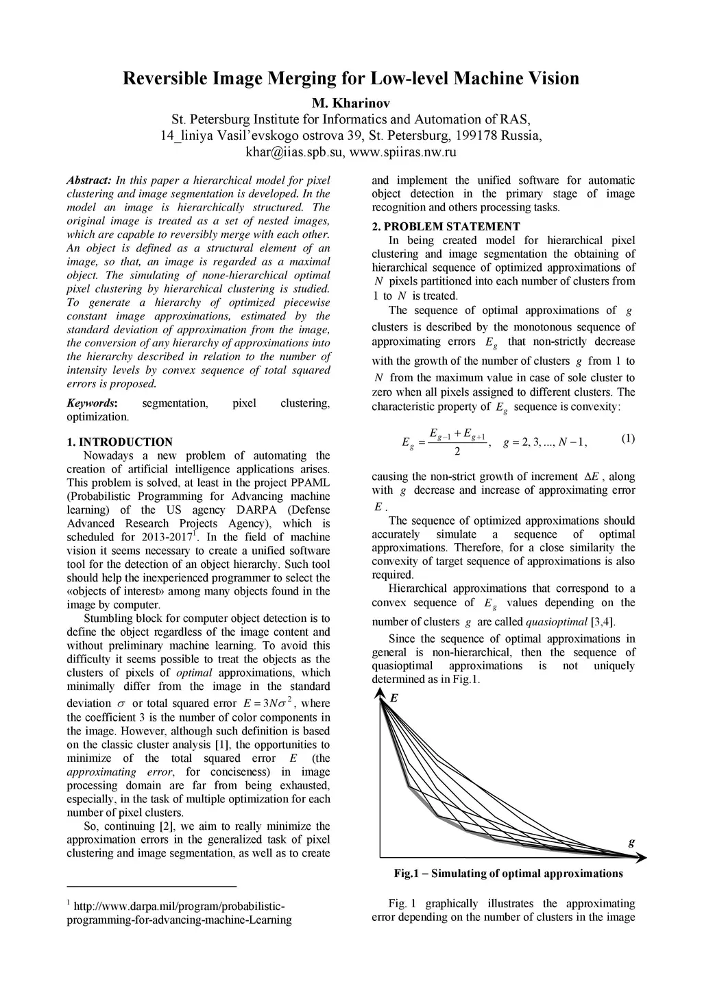 In this paper a hierarchical model for pixel clustering and image segmentation is developed. In the model an image is hierarchically structured. The original image is treated as a set of nested images, which are capable to reversibly merge with each other. An object is defined as a structural element of an image, so that, an image is regarded as a maximal object. The simulating of none-hierarchical optimal pixel clustering by hierarchical clustering is studied. To generate a hierarchy of optimized piecewise constant image approximations, estimated by the standard deviation of approximation from the image, the conversion of any hierarchy of approximations into the hierarchy described in relation to the number of intensity levels by convex sequence of total squared errors is proposed.