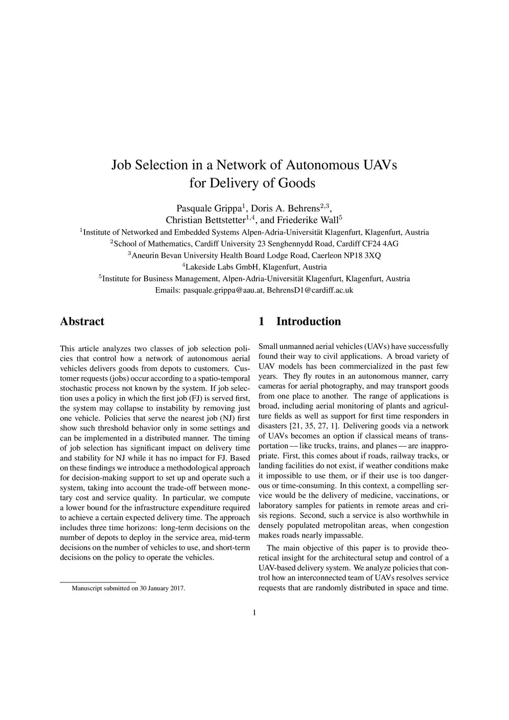 Job Selection in a Network of Autonomous UAVs for Delivery of Goods