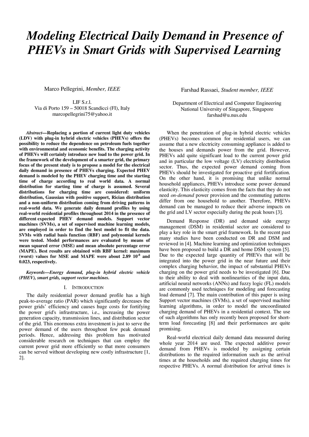 Replacing a portion of current light duty vehicles (LDV) with plug-in hybrid electric vehicles (PHEVs) offers the possibility to reduce the dependence on petroleum fuels together with environmental and economic benefits. The charging activity of PHEVs will certainly introduce new load to the power grid. In the framework of the development of a smarter grid, the primary focus of the present study is to propose a model for the electrical daily demand in presence of PHEVs charging. Expected PHEV demand is modeled by the PHEV charging time and the starting time of charge according to real world data. A normal distribution for starting time of charge is assumed. Several distributions for charging time are considered: uniform distribution, Gaussian with positive support, Rician distribution and a non-uniform distribution coming from driving patterns in real-world data. We generate daily demand profiles by using real-world residential profiles throughout 2014 in the presence of different expected PHEV demand models. Support vector machines (SVMs), a set of supervised machine learning models, are employed in order to find the best model to fit the data. SVMs with radial basis function (RBF) and polynomial kernels were tested. Model performances are evaluated by means of mean squared error (MSE) and mean absolute percentage error (MAPE). Best results are obtained with RBF kernel: maximum (worst) values for MSE and MAPE were about 2.89 10-8 and 0.023, respectively.