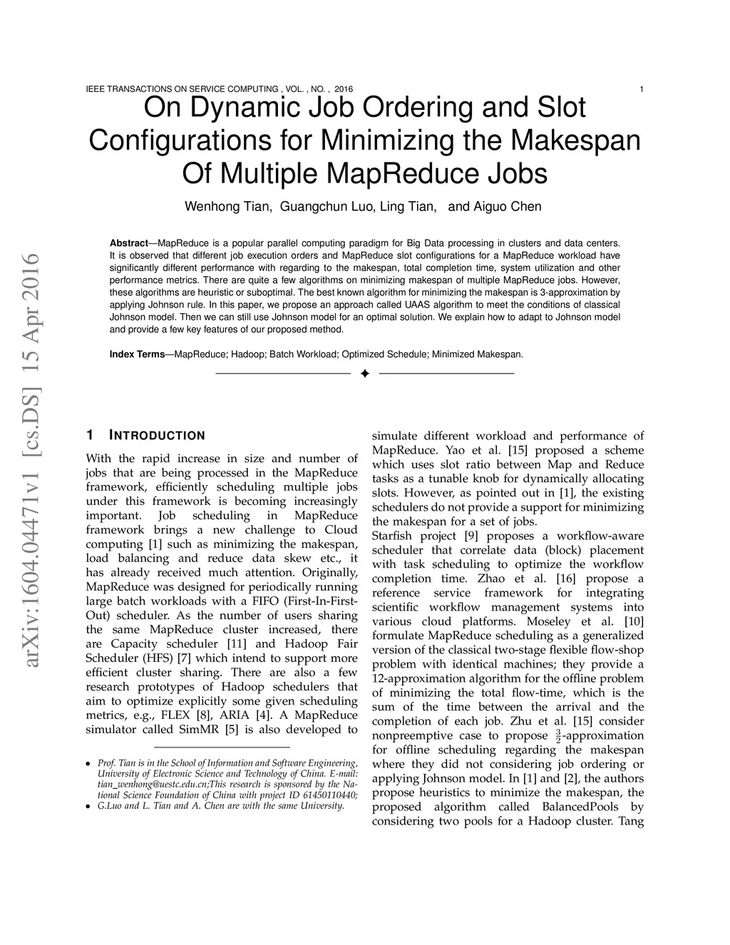MapReduce is a popular parallel computing paradigm for Big Data processing in clusters and data centers. It is observed that different job execution orders and MapReduce slot configurations for a MapReduce workload have significantly different performance with regarding to the makespan, total completion time, system utilization and other performance metrics. There are quite a few algorithms on minimizing makespan of multiple MapReduce jobs. However, these algorithms are heuristic or suboptimal. The best known algorithm for minimizing the makespan is 3-approximation by applying Johnson rule. In this paper, we propose an approach called UAAS algorithm to meet the conditions of classical Johnson model. Then we can still use Johnson model for an optimal solution. We explain how to adapt to Johnson model and provide a few key features of our proposed method.
