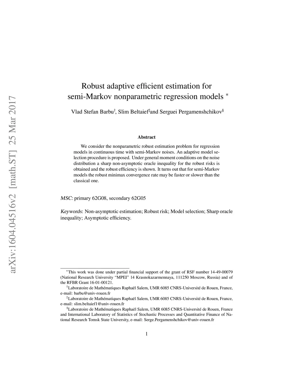 We consider the nonparametric robust estimation problem for regression models in continuous time with semi-Markov noises. An adaptive model selection procedure is proposed. Under general moment conditions on the noise distribution a sharp non-asymptotic oracle inequality for the robust risks is obtained and the robust efficiency is shown. It turns out that for semi-Markov models the robust minimax convergence rate may be faster or slower than the classical one.