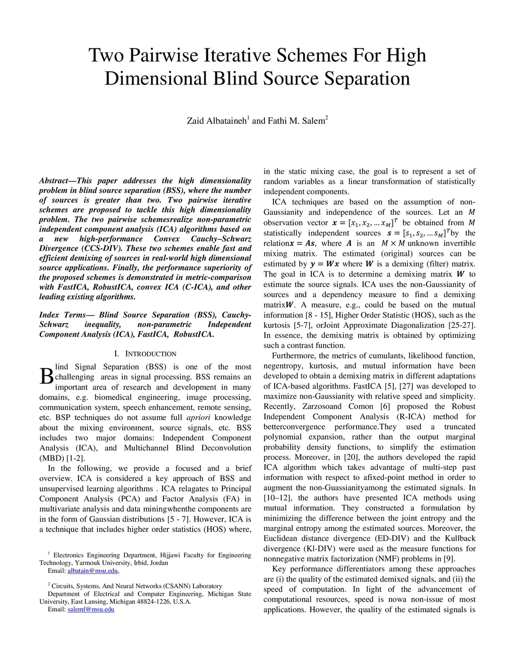 This paper addresses the high dimensionality problem in blind source separation (BSS), where the number of sources is greater than two. Two pairwise iterative schemes are proposed to tackle this high dimensionality problem. The two pairwise schemes realize nonparametric independent component analysis (ICA) algorithms based on a new high-performance Convex CauchySchwarz Divergence (CCSDIV). These two schemes enable fast and efficient demixing of sources in real-world high dimensional source applications. Finally, the performance superiority of the proposed schemes is demonstrated in metric-comparison with FastICA, RobustICA, convex ICA (CICA), and other leading existing algorithms.