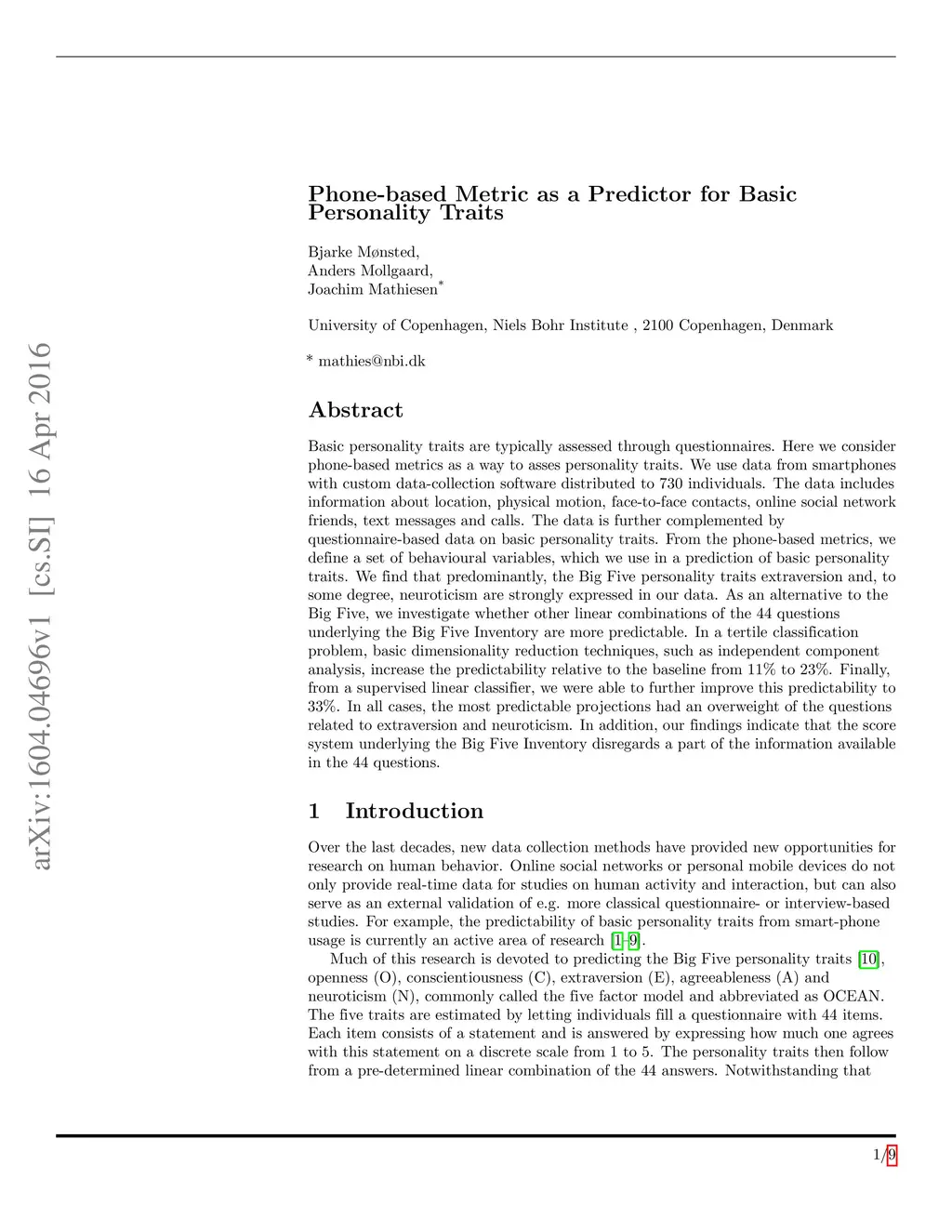Basic personality traits are typically assessed through questionnaires. Here we consider phone-based metrics as a way to asses personality traits. We use data from smartphones with custom data-collection software distributed to 730 individuals. The data includes information about location, physical motion, face-to-face contacts, online social network friends, text messages and calls. The data is further complemented by questionnaire-based data on basic personality traits. From the phone-based metrics, we define a set of behavioral variables, which we use in a prediction of basic personality traits. We find that predominantly, the Big Five personality traits extraversion and, to some degree, neuroticism are strongly expressed in our data. As an alternative to the Big Five, we investigate whether other linear combinations of the 44 questions underlying the Big Five Inventory are more predictable. In a tertile classification problem, basic dimensionality reduction techniques, such as independent component analysis, increase the predictability relative to the baseline from to . Finally, from a supervised linear classifier, we were able to further improve this predictability to . In all cases, the most predictable projections had an overweight of the questions related to extraversion and neuroticism. In addition, our findings indicate that the score system underlying the Big Five Inventory disregards a part of the information available in the 44 questions.