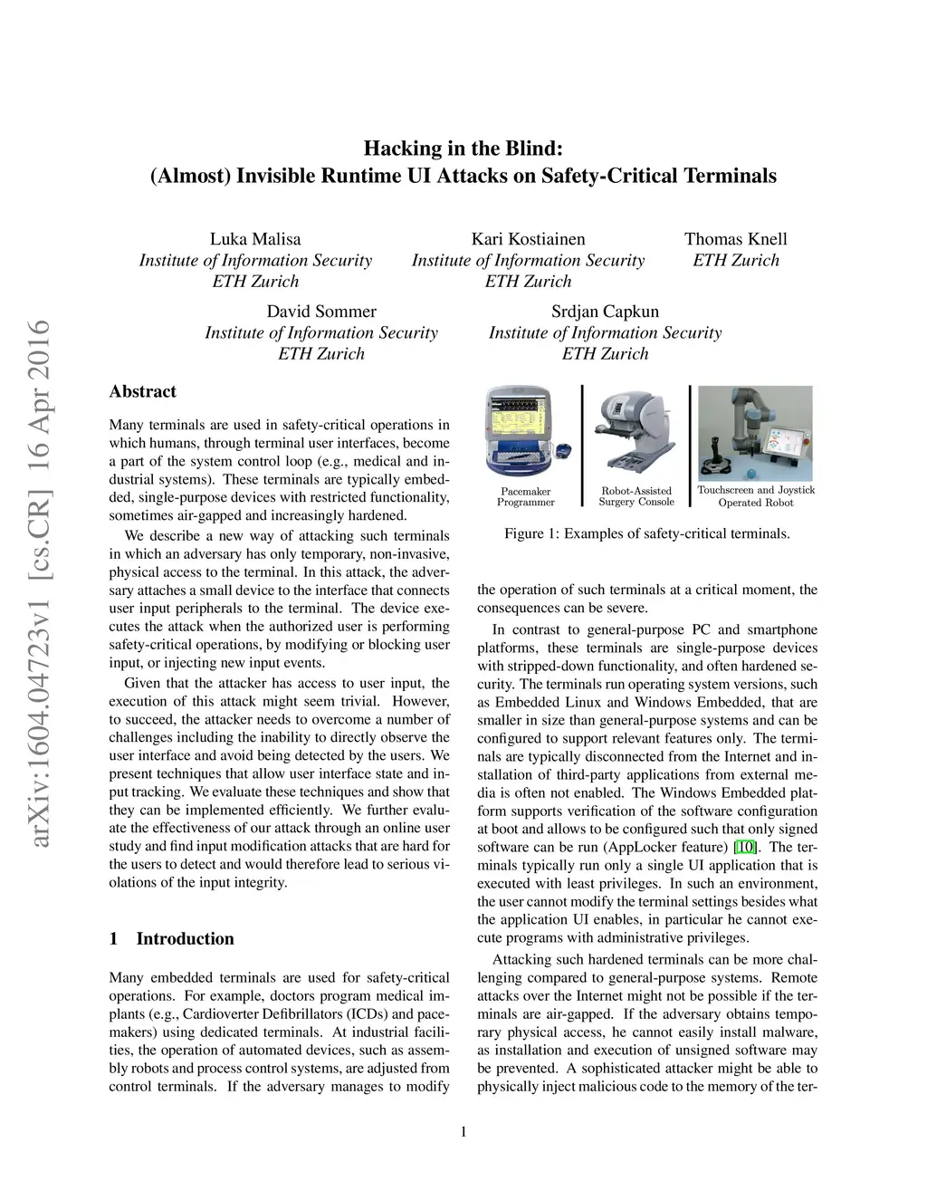 Many terminals are used in safety-critical operations in which humans, through terminal user interfaces, become a part of the system control loop (e.g., medical and industrial systems). These terminals are typically embedded, single-purpose devices with restricted functionality, sometimes air-gapped and increasingly hardened. We describe a new way of attacking such terminals in which an adversary has only temporary, non-invasive, physical access to the terminal. In this attack, the adversary attaches a small device to the interface that connects user input peripherals to the terminal. The device executes the attack when the authorized user is performing safety-critical operations, by modifying or blocking user input, or injecting new input events. Given that the attacker has access to user input, the execution of this attack might seem trivial. However, to succeed, the attacker needs to overcome a number of challenges including the inability to directly observe the user interface and avoid being detected by the users. We present techniques that allow user interface state and input tracking. We evaluate these techniques and show that they can be implemented efficiently. We further evaluate the effectiveness of our attack through an online user study and find input modification attacks that are hard for the users to detect and would therefore lead to serious violations of the input integrity.
