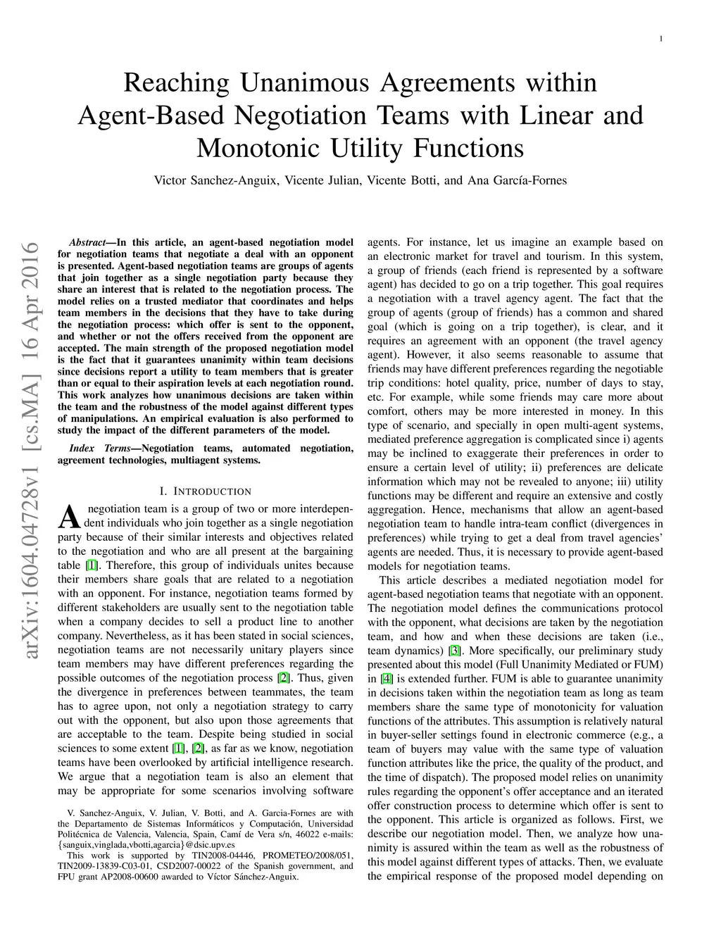 In this article, an agent-based negotiation model for negotiation teams that negotiate a deal with an opponent is presented. Agent-based negotiation teams are groups of agents that join together as a single negotiation party because they share an interest that is related to the negotiation process. The model relies on a trusted mediator that coordinates and helps team members in the decisions that they have to take during the negotiation process: which offer is sent to the opponent, and whether the offers received from the opponent are accepted. The main strength of the proposed negotiation model is the fact that it guarantees unanimity within team decisions since decisions report a utility to team members that is greater than or equal to their aspiration levels at each negotiation round. This work analyzes how unanimous decisions are taken within the team and the robustness of the model against different types of manipulations. An empirical evaluation is also performed to study the impact of the different parameters of the model.
