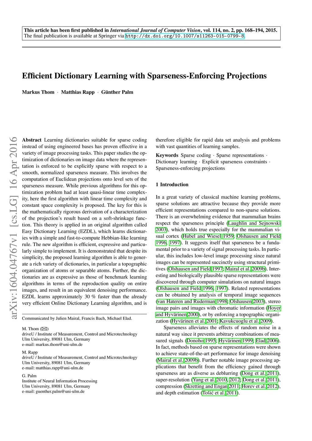 Learning dictionaries suitable for sparse coding instead of using engineered bases has proven effective in a variety of image processing tasks. This paper studies the optimization of dictionaries on image data where the representation is enforced to be explicitly sparse with respect to a smooth, normalized sparseness measure. This involves the computation of Euclidean projections onto level sets of the sparseness measure. While previous algorithms for this optimization problem had at least quasi-linear time complexity, here the first algorithm with linear time complexity and constant space complexity is proposed. The key for this is the mathematically rigorous derivation of a characterization of the projection's result based on a soft-shrinkage function. This theory is applied in an original algorithm called Easy Dictionary Learning (EZDL), which learns dictionaries with a simple and fast-to-compute Hebbian-like learning rule. The new algorithm is efficient, expressive and particularly simple to implement. It is demonstrated that despite its simplicity, the proposed learning algorithm is able to generate a rich variety of dictionaries, in particular a topographic organization of atoms or separable atoms. Further, the dictionaries are as expressive as those of benchmark learning algorithms in terms of the reproduction quality on entire images, and result in an equivalent denoising performance. EZDL learns approximately 30 % faster than the already very efficient Online Dictionary Learning algorithm, and is therefore eligible for rapid data set analysis and problems with vast quantities of learning samples.