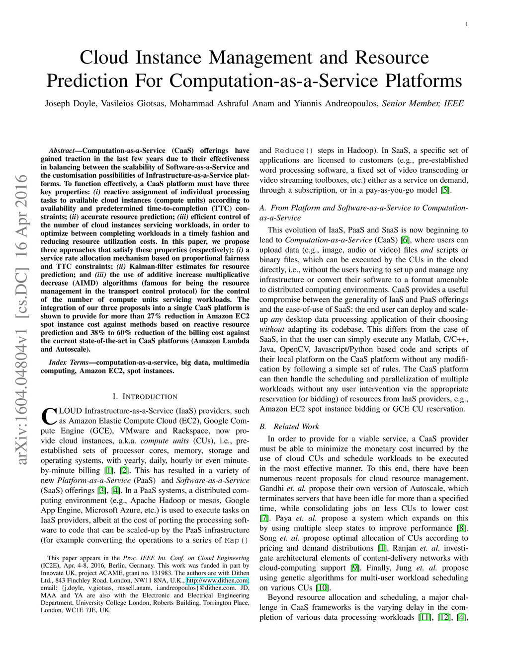 Computation-as-a-Service (CaaS) offerings have gained traction in the last few years due to their effectiveness in balancing between the scalability of Software-as-a-Service and the customisation possibilities of Infrastructure-as-a-Service platforms. To function effectively, a CaaS platform must have three key properties: (i) reactive assignment of individual processing tasks to available cloud instances (compute units) according to availability and predetermined time-to-completion (TTC) constraints; (ii) accurate resource prediction; (iii) efficient control of the number of cloud instances servicing workloads, in order to optimize between completing workloads in a timely fashion and reducing resource utilization costs. In this paper, we propose three approaches that satisfy these properties (respectively): (i) a service rate allocation mechanism based on proportional fairness and TTC constraints; (ii) Kalman-filter estimates for resource prediction; and (iii) the use of additive increase multiplicative decrease (AIMD) algorithms (famous for being the resource management in the transport control protocol) for the control of the number of compute units servicing workloads. The integration of our three proposals\ into a single CaaS platform is shown to provide for more than 27% reduction in Amazon EC2 spot instance cost against methods based on reactive resource prediction and 38% to 60% reduction of the billing cost against the current state-of-the-art in CaaS platforms (Amazon Lambda and Autoscale).