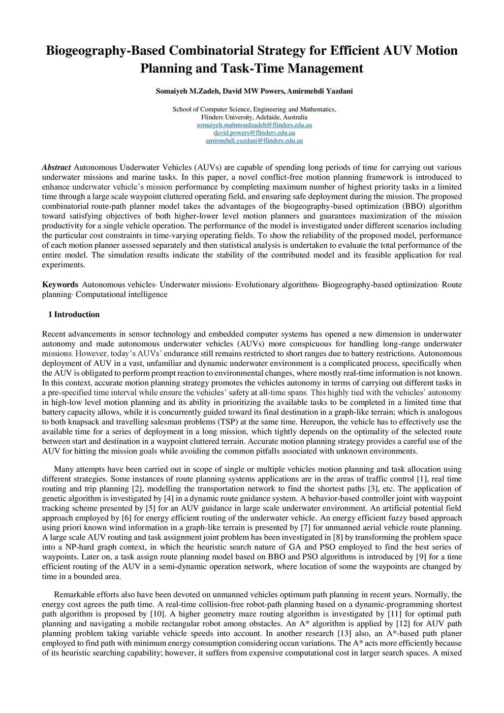 Biogeography-Based Combinatorial Strategy for Efficient AUV Motion