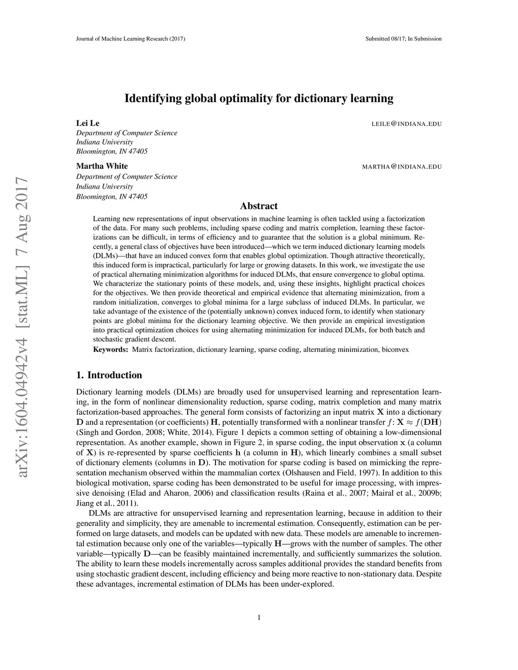 Learning new representations of input observations in machine learning is often tackled using a factorization of the data. For many such problems, including sparse coding and matrix completion, learning these factorizations can be difficult, in terms of efficiency and to guarantee that the solution is a global minimum. Recently, a general class of objectives have been introduced-which we term induced dictionary learning models (DLMs)-that have an induced convex form that enables global optimization. Though attractive theoretically, this induced form is impractical, particularly for large or growing datasets. In this work, we investigate the use of practical alternating minimization algorithms for induced DLMs, that ensure convergence to global optima. We characterize the stationary points of these models, and, using these insights, highlight practical choices for the objectives. We then provide theoretical and empirical evidence that alternating minimization, from a random initialization, converges to global minima for a large subclass of induced DLMs. In particular, we take advantage of the existence of the (potentially unknown) convex induced form, to identify when stationary points are global minima for the dictionary learning objective. We then provide an empirical investigation into practical optimization choices for using alternating minimization for induced DLMs, for both batch and stochastic gradient descent.