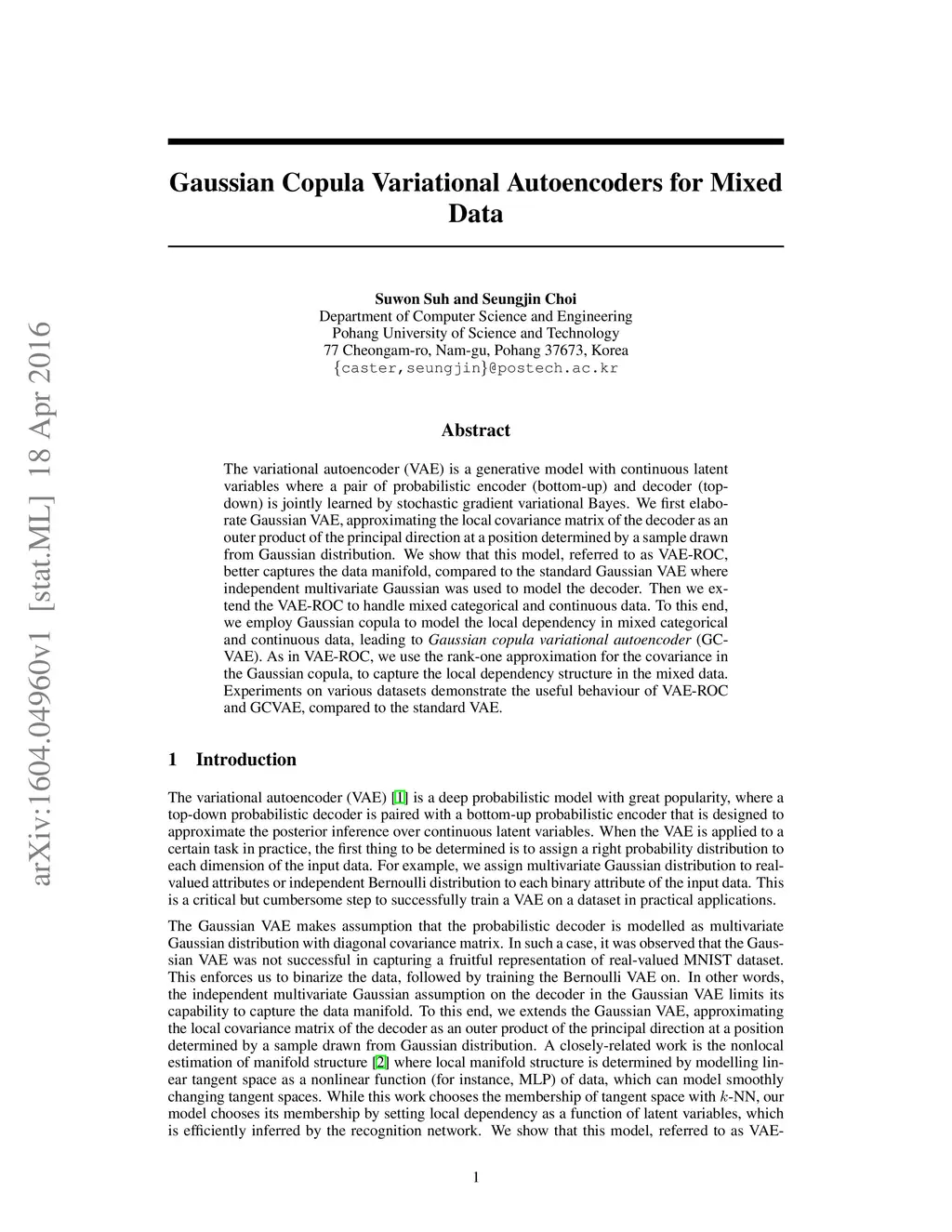 The variational autoencoder (VAE) is a generative model with continuous latent variables where a pair of probabilistic encoder (bottom-up) and decoder (top-down) is jointly learned by stochastic gradient variational Bayes. We first elaborate Gaussian VAE, approximating the local covariance matrix of the decoder as an outer product of the principal direction at a position determined by a sample drawn from Gaussian distribution. We show that this model, referred to as VAE-ROC, better captures the data manifold, compared to the standard Gaussian VAE where independent multivariate Gaussian was used to model the decoder. Then we extend the VAE-ROC to handle mixed categorical and continuous data. To this end, we employ Gaussian copula to model the local dependency in mixed categorical and continuous data, leading to {\em Gaussian copula variational autoencoder} (GCVAE). As in VAE-ROC, we use the rank-one approximation for the covariance in the Gaussian copula, to capture the local dependency structure in the mixed data. Experiments on various datasets demonstrate the useful behaviour of VAE-ROC and GCVAE, compared to the standard VAE.