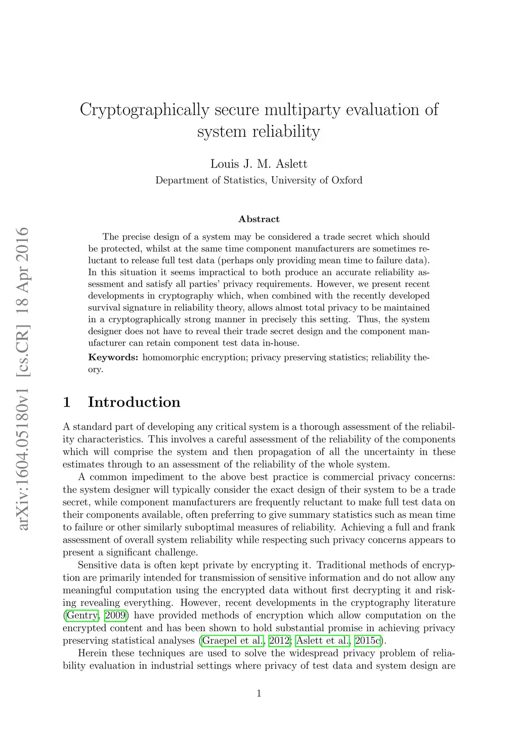 The precise design of a system may be considered a trade secret which should be protected, whilst at the same time component manufacturers are sometimes reluctant to release full test data (perhaps only providing mean time to failure data). In this situation it seems impractical to both produce an accurate reliability assessment and satisfy all parties' privacy requirements. However, we present recent developments in cryptography which, when combined with the recently developed survival signature in reliability theory, allows almost total privacy to be maintained in a cryptographically strong manner in precisely this setting. Thus, the system designer does not have to reveal their trade secret design and the component manufacturer can retain component test data in-house.