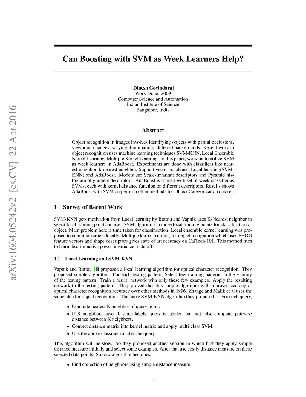 Object recognition in images involves identifying objects with partial occlusions, viewpoint changes, varying illumination, cluttered backgrounds. Recent work in object recognition uses machine learning techniques SVM-KNN, Local Ensemble Kernel Learning, Multiple Kernel Learning. In this paper, we want to utilize SVM as week learners in AdaBoost. Experiments are done with classifiers like near- est neighbor, k-nearest neighbor, Support vector machines, Local learning(SVM- KNN) and AdaBoost. Models use Scale-Invariant descriptors and Pyramid his- togram of gradient descriptors. AdaBoost is trained with set of week classifier as SVMs, each with kernel distance function on different descriptors. Results shows AdaBoost with SVM outperform other methods for Object Categorization dataset.