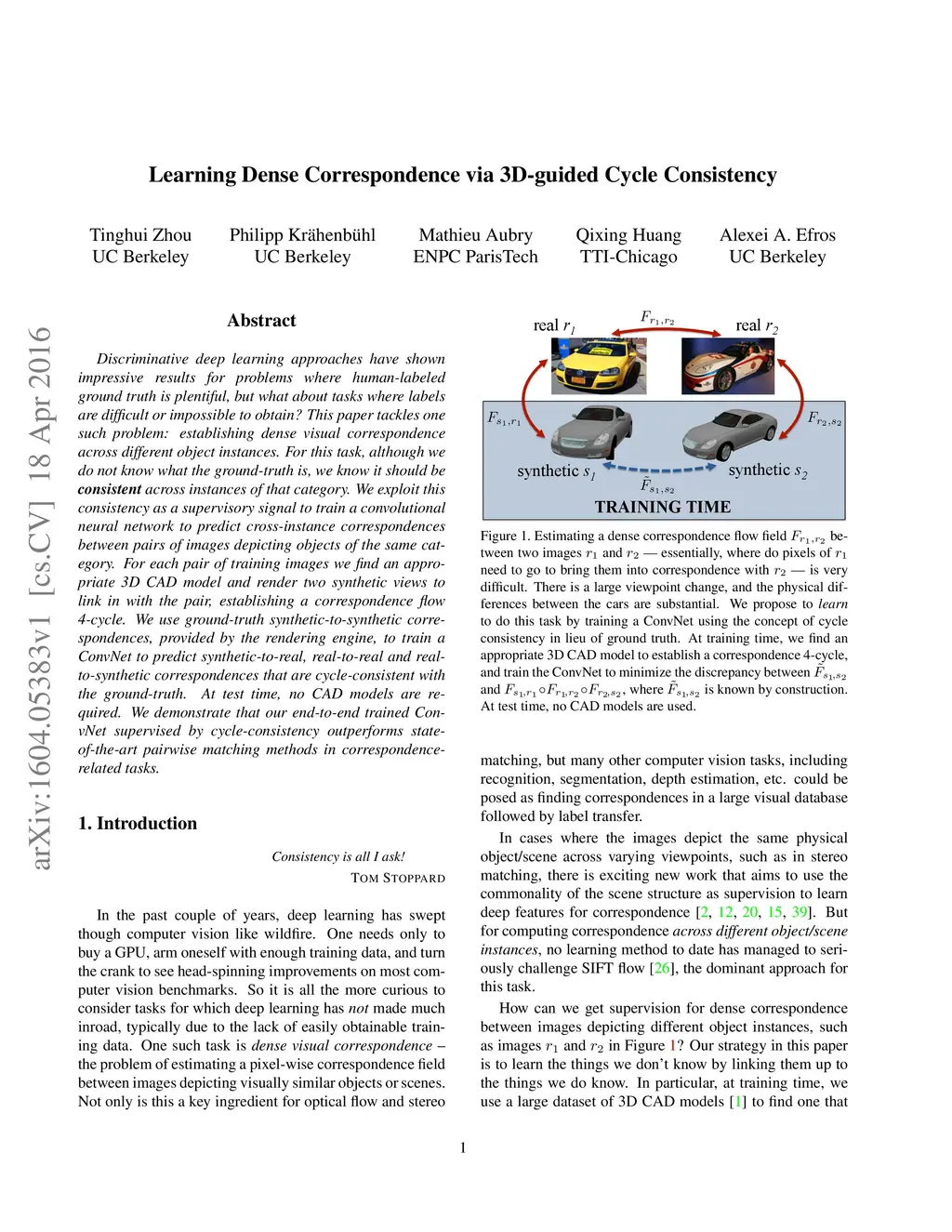Discriminative deep learning approaches have shown impressive results for problems where human-labeled ground truth is plentiful, but what about tasks where labels are difficult or impossible to obtain? This paper tackles one such problem: establishing dense visual correspondence across different object instances. For this task, although we do not know what the ground-truth is, we know it should be consistent across instances of that category. We exploit this consistency as a supervisory signal to train a convolutional neural network to predict cross-instance correspondences between pairs of images depicting objects of the same category. For each pair of training images we find an appropriate 3D CAD model and render two synthetic views to link in with the pair, establishing a correspondence flow 4-cycle. We use ground-truth synthetic-to-synthetic correspondences, provided by the rendering engine, to train a ConvNet to predict synthetic-to-real, real-to-real and real-to-synthetic correspondences that are cycle-consistent with the ground-truth. At test time, no CAD models are required. We demonstrate that our end-to-end trained ConvNet supervised by cycle-consistency outperforms state-of-the-art pairwise matching methods in correspondence-related tasks.