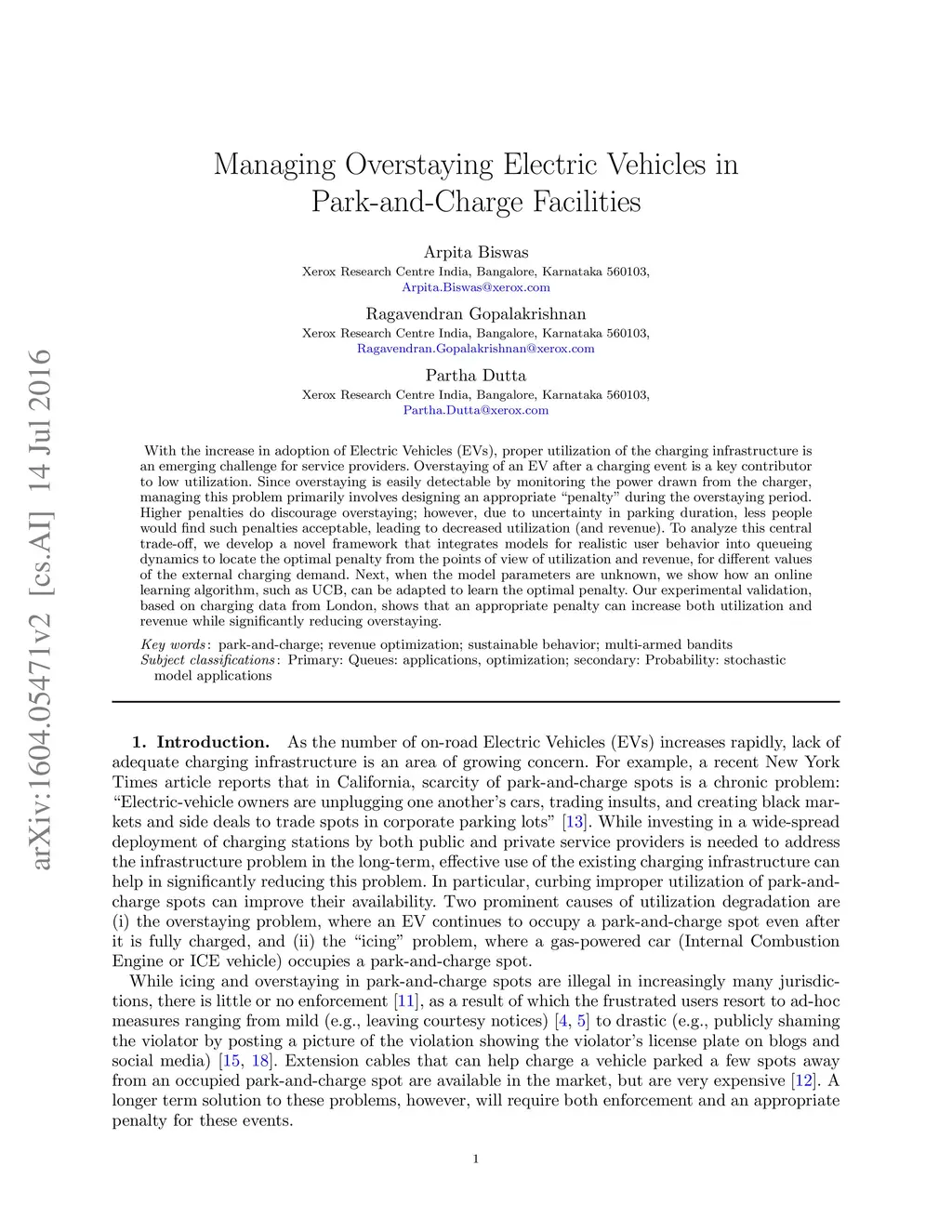 With the increase in adoption of Electric Vehicles (EVs), proper utilization of the charging infrastructure is an emerging challenge for service providers. Overstaying of an EV after a charging event is a key contributor to low utilization. Since overstaying is easily detectable by monitoring the power drawn from the charger, managing this problem primarily involves designing an appropriate "penalty" during the overstaying period. Higher penalties do discourage overstaying; however, due to uncertainty in parking duration, less people would find such penalties acceptable, leading to decreased utilization (and revenue). To analyze this central trade-off, we develop a novel framework that integrates models for realistic user behavior into queueing dynamics to locate the optimal penalty from the points of view of utilization and revenue, for different values of the external charging demand. Next, when the model parameters are unknown, we show how an online learning algorithm, such as UCB, can be adapted to learn the optimal penalty. Our experimental validation, based on charging data from London, shows that an appropriate penalty can increase both utilization and revenue while significantly reducing overstaying.