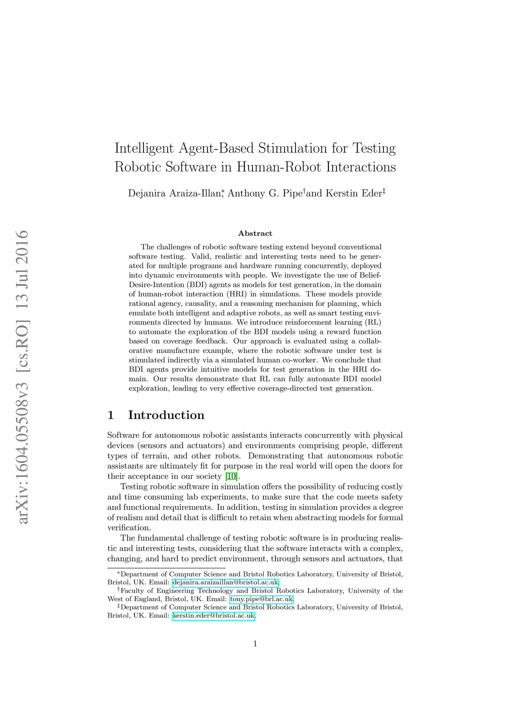 The challenges of robotic software testing extend beyond conventional software testing. Valid, realistic and interesting tests need to be generated for multiple programs and hardware running concurrently, deployed into dynamic environments with people. We investigate the use of Belief-Desire-Intention (BDI) agents as models for test generation, in the domain of human-robot interaction (HRI) in simulations. These models provide rational agency, causality, and a reasoning mechanism for planning, which emulate both intelligent and adaptive robots, as well as smart testing environments directed by humans. We introduce reinforcement learning (RL) to automate the exploration of the BDI models using a reward function based on coverage feedback. Our approach is evaluated using a collaborative manufacture example, where the robotic software under test is stimulated indirectly via a simulated human co-worker. We conclude that BDI agents provide intuitive models for test generation in the HRI domain. Our results demonstrate that RL can fully automate BDI model exploration, leading to very effective coverage-directed test generation.