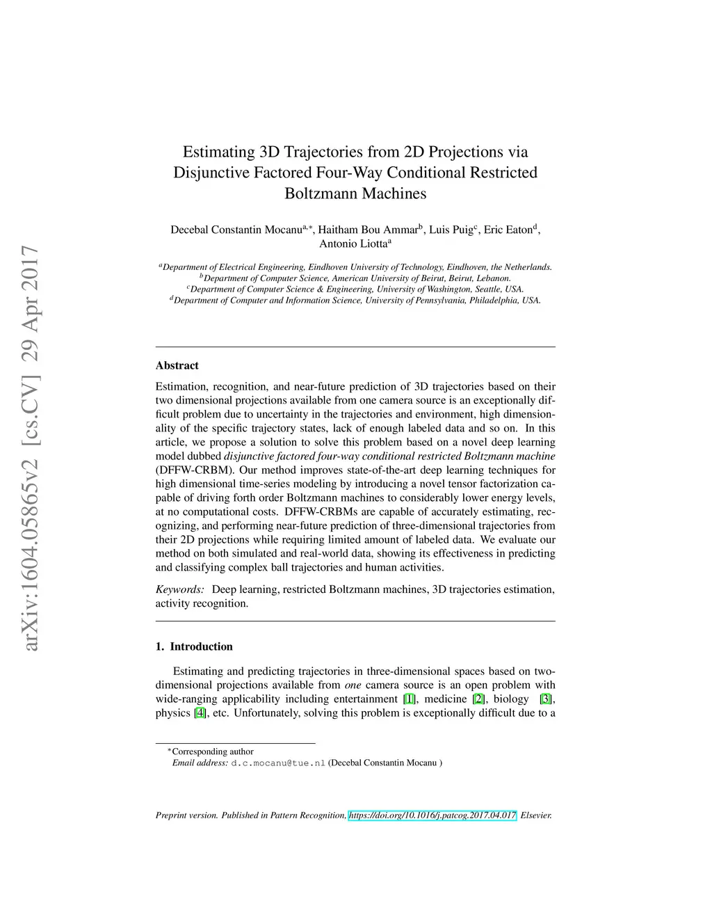 Estimation, recognition, and near-future prediction of 3D trajectories based on their two dimensional projections available from one camera source is an exceptionally difficult problem due to uncertainty in the trajectories and environment, high dimensionality of the specific trajectory states, lack of enough labeled data and so on. In this article, we propose a solution to solve this problem based on a novel deep learning model dubbed Disjunctive Factored Four-Way Conditional Restricted Boltzmann Machine (DFFW-CRBM). Our method improves state-of-the-art deep learning techniques for high dimensional time-series modeling by introducing a novel tensor factorization capable of driving forth order Boltzmann machines to considerably lower energy levels, at no computational costs. DFFW-CRBMs are capable of accurately estimating, recognizing, and performing near-future prediction of three-dimensional trajectories from their 2D projections while requiring limited amount of labeled data. We evaluate our method on both simulated and real-world data, showing its effectiveness in predicting and classifying complex ball trajectories and human activities.