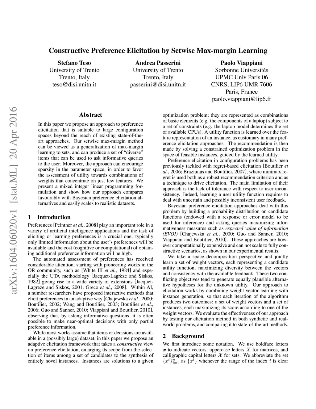 In this paper we propose an approach to preference elicitation that is suitable to large configuration spaces beyond the reach of existing state-of-the-art approaches. Our setwise max-margin method can be viewed as a generalization of max-margin learning to sets, and can produce a set of "diverse" items that can be used to ask informative queries to the user. Moreover, the approach can encourage sparsity in the parameter space, in order to favor the assessment of utility towards combinations of weights that concentrate on just few features. We present a mixed integer linear programming formulation and show how our approach compares favourably with Bayesian preference elicitation alternatives and easily scales to realistic datasets.