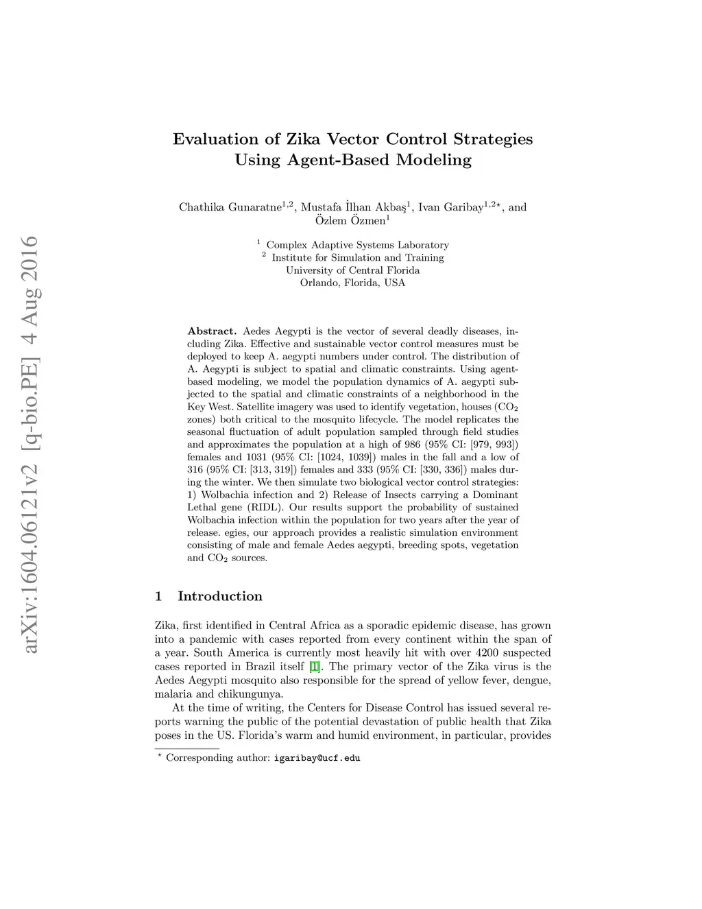Aedes Aegypti is the vector of several deadly diseases, including Zika. Effective and sustainable vector control measures must be deployed to keep A. aegypti numbers under control. The distribution of A. Aegypti is subject to spatial and climatic constraints. Using agent-based modeling, we model the population dynamics of A. aegypti subjected to the spatial and climatic constraints of a neighborhood in the Key West. Satellite imagery was used to identify vegetation, houses (CO2 zones) both critical to the mosquito lifecycle. The model replicates the seasonal fluctuation of adult population sampled through field studies and approximates the population at a high of 986 (95% CI: [979, 993]) females and 1031 (95% CI: [1024, 1039]) males in the fall and a low of 316 (95% CI: [313, 319]) females and 333 (95% CI: [330, 336]) males during the winter. We then simulate two biological vector control strategies: 1) Wolbachia infection and 2) Release of Insects carrying a Dominant Lethal gene (RIDL). Our results support the probability of sustained Wolbachia infection within the population for two years after the year of release. egies, our approach provides a realistic simulation environment consisting of male and female Aedes aegypti, breeding spots, vegetation and CO2 sources.