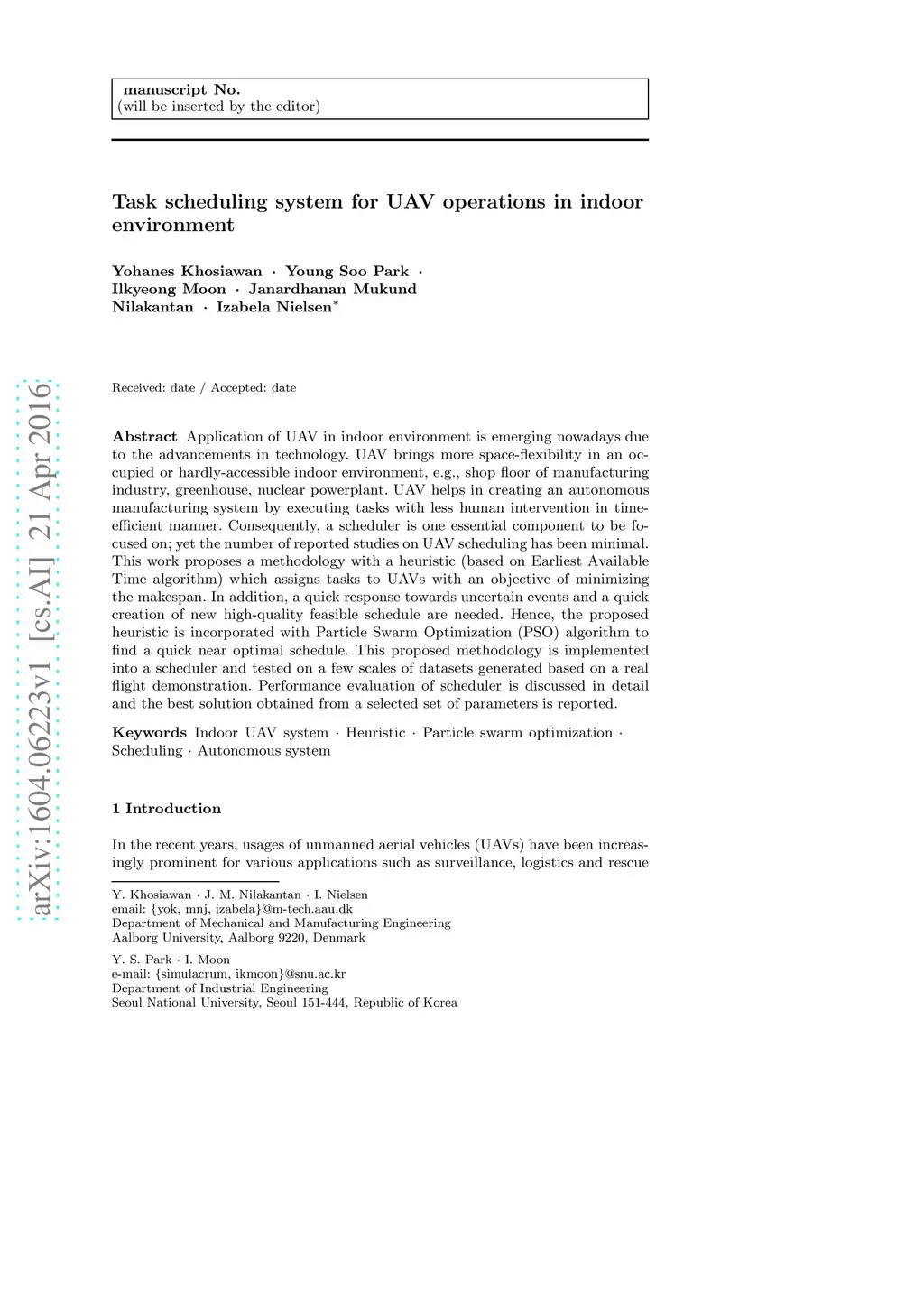 Application of UAV in indoor environment is emerging nowadays due to the advancements in technology. UAV brings more space-flexibility in an occupied or hardly-accessible indoor environment, e.g., shop floor of manufacturing industry, greenhouse, nuclear powerplant. UAV helps in creating an autonomous manufacturing system by executing tasks with less human intervention in time-efficient manner. Consequently, a scheduler is one essential component to be focused on; yet the number of reported studies on UAV scheduling has been minimal. This work proposes a methodology with a heuristic (based on Earliest Available Time algorithm) which assigns tasks to UAVs with an objective of minimizing the makespan. In addition, a quick response towards uncertain events and a quick creation of new high-quality feasible schedule are needed. Hence, the proposed heuristic is incorporated with Particle Swarm Optimization (PSO) algorithm to find a quick near optimal schedule. This proposed methodology is implemented into a scheduler and tested on a few scales of datasets generated based on a real flight demonstration. Performance evaluation of scheduler is discussed in detail and the best solution obtained from a selected set of parameters is reported.